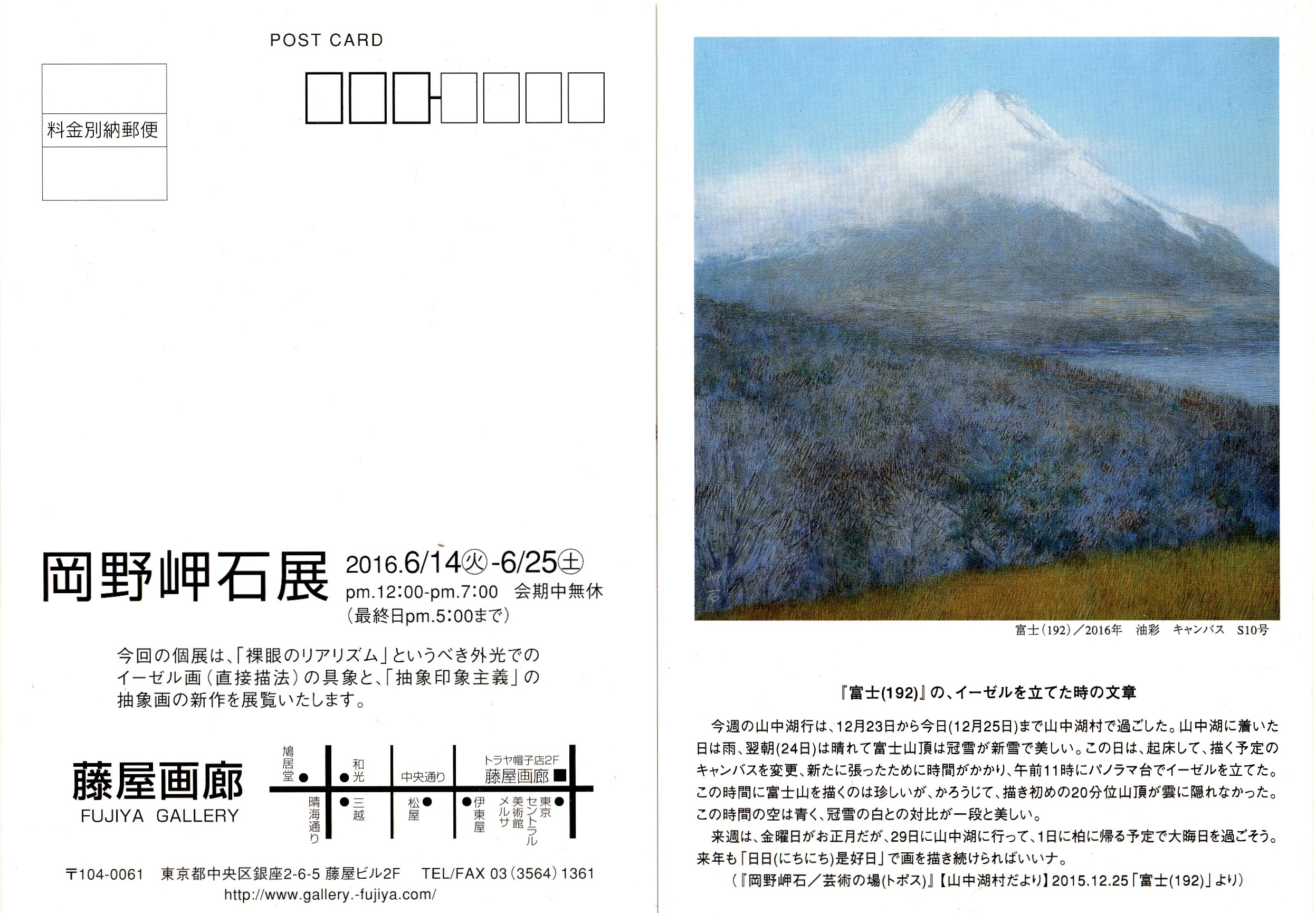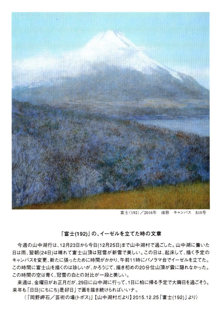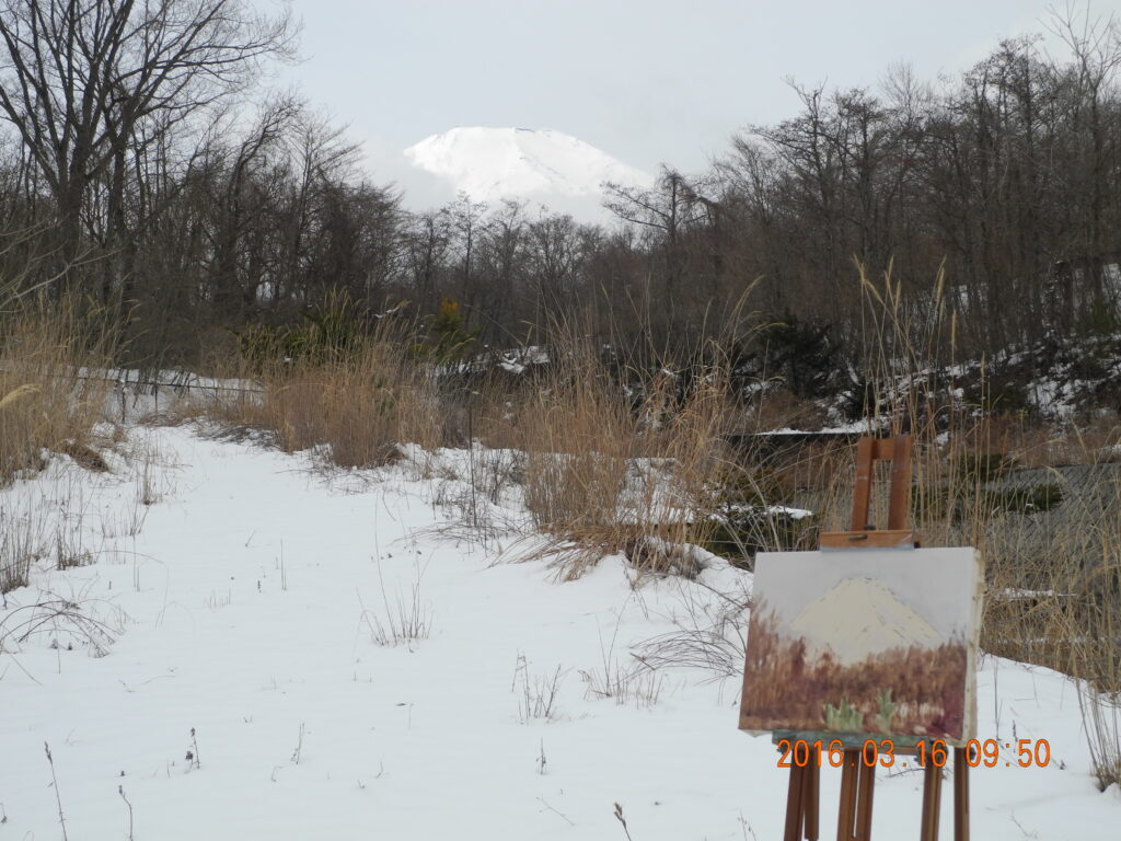 今回は、雪と寒さの土地の、暮しにくさに心が少し萎えた。ゴッホもセザンヌもマチスもルノワールも南仏の陽光溢れる土地で過ごしていたし、富士山ももうすぐ200点を超えるので、今年の秋を過ぎたら、今度は伊豆の下田の方にアトリエを移そうかな。
