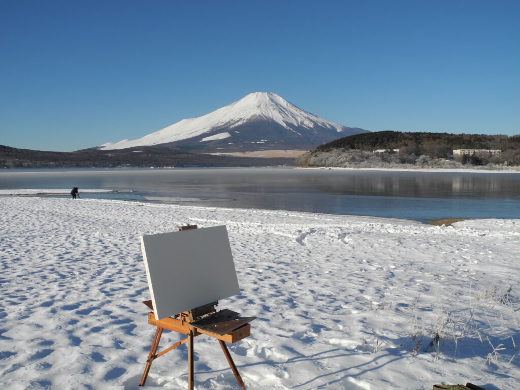 この冬はこれまで富士山頂の雪が少なかったので、翌日(20日)は、前日タップリと冠雪した富士山を描こうと、大きめのキャンバス(M25号)を張って、朝7時26分発のバスに乗るためにバス停で待つ。しかし、寒さのなか、1時間たってもバスが来ない。富士吉田の街を通って、山中湖に来るので、凍結した道路で渋滞しているようだ(今日の帰柏も1時間遅れた)。こういう時の、決断は迷う。折角待ったのだから、というのと、このまま待ち続けても予測(バス会社に電話しても駄目だった)がつかないので、1時間経ったら、諦めて帰ろうと決め、ちょうど、イーゼルを担ぎ直したところで、直線道路の遠くにバスが見えた。