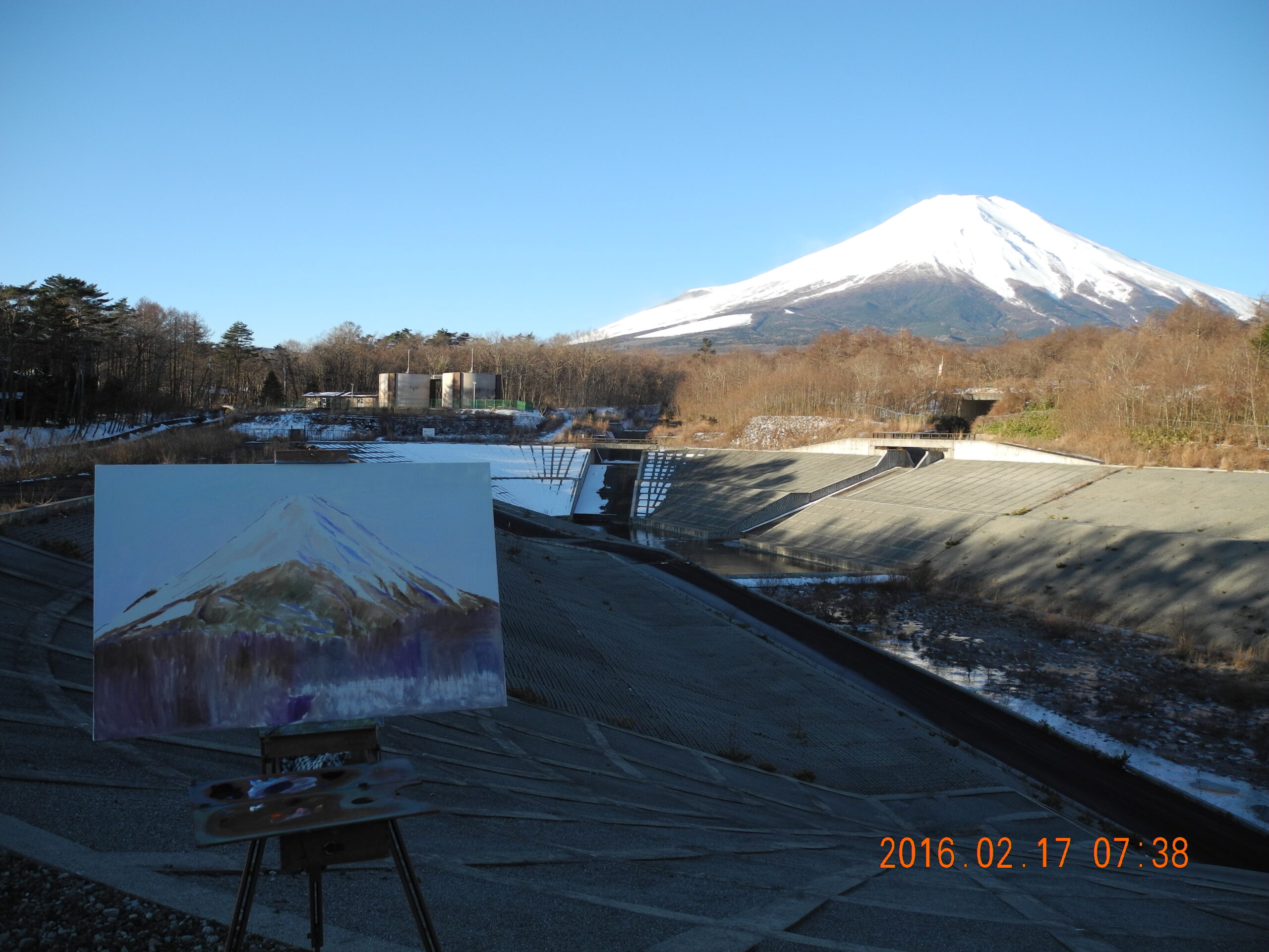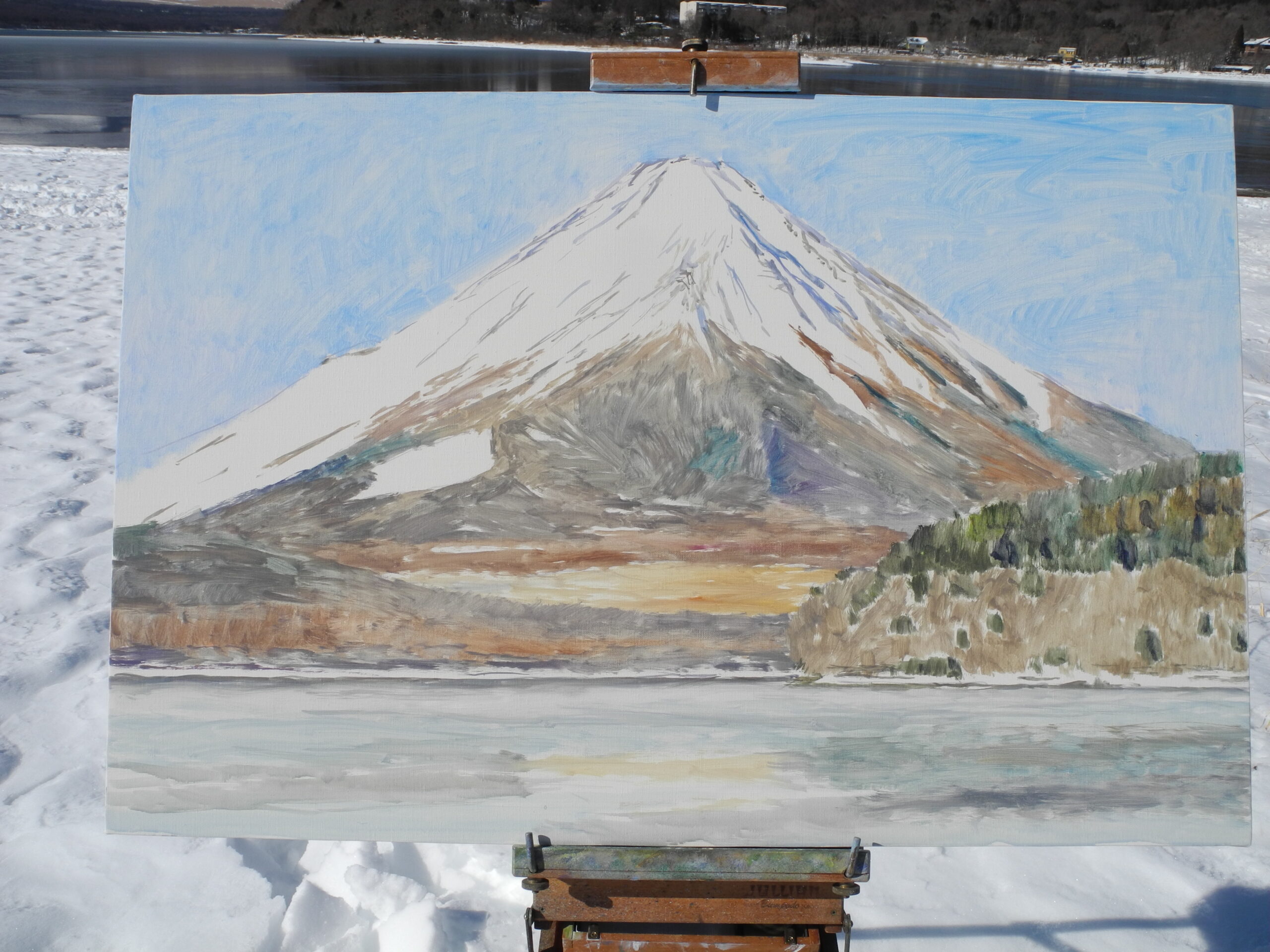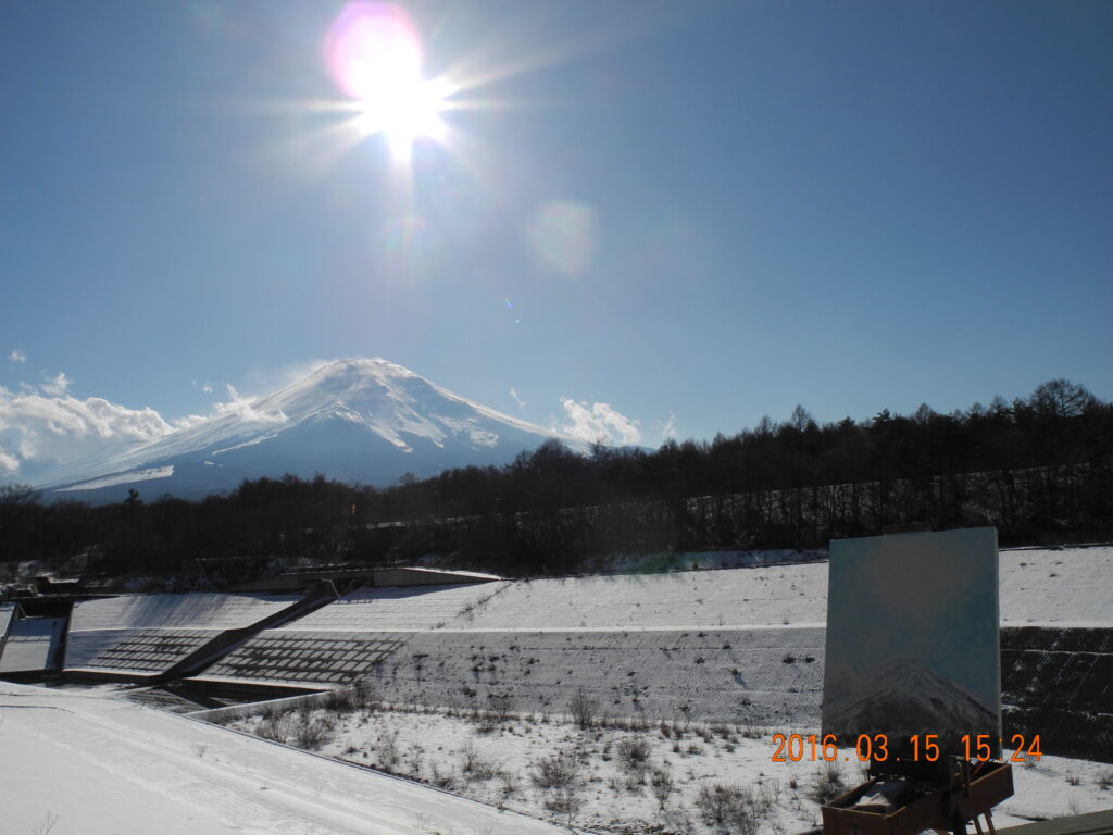 今回の山中湖行は、15日から今日(17日)まで山中湖村で過ごした。着いた日(15日)は、晴れていたので、先週と同じく、3時頃富士山の真上に太陽が位置する状景をねらって、急ぎ調節池に出かける。特殊な光で、冠雪の反射の位置が、刻々変わるが、先週F5号のキャンバスで描いた記憶がまだハッキリあるので、今回は余裕がある。このまま、時間が経過すると太陽は富士山の向って右裾に落ちていって、それも絵になりそうだが、そうなると太陽の前後(奥行)の位置が、山の後になるため、山全体が逆光になり、冠雪と山裾の明暗の差がシルエットで青くつぶれてしまうため、画興がいまいち湧かない。富士の200点目は、P12号のキャンバスの縦構図で着手した。