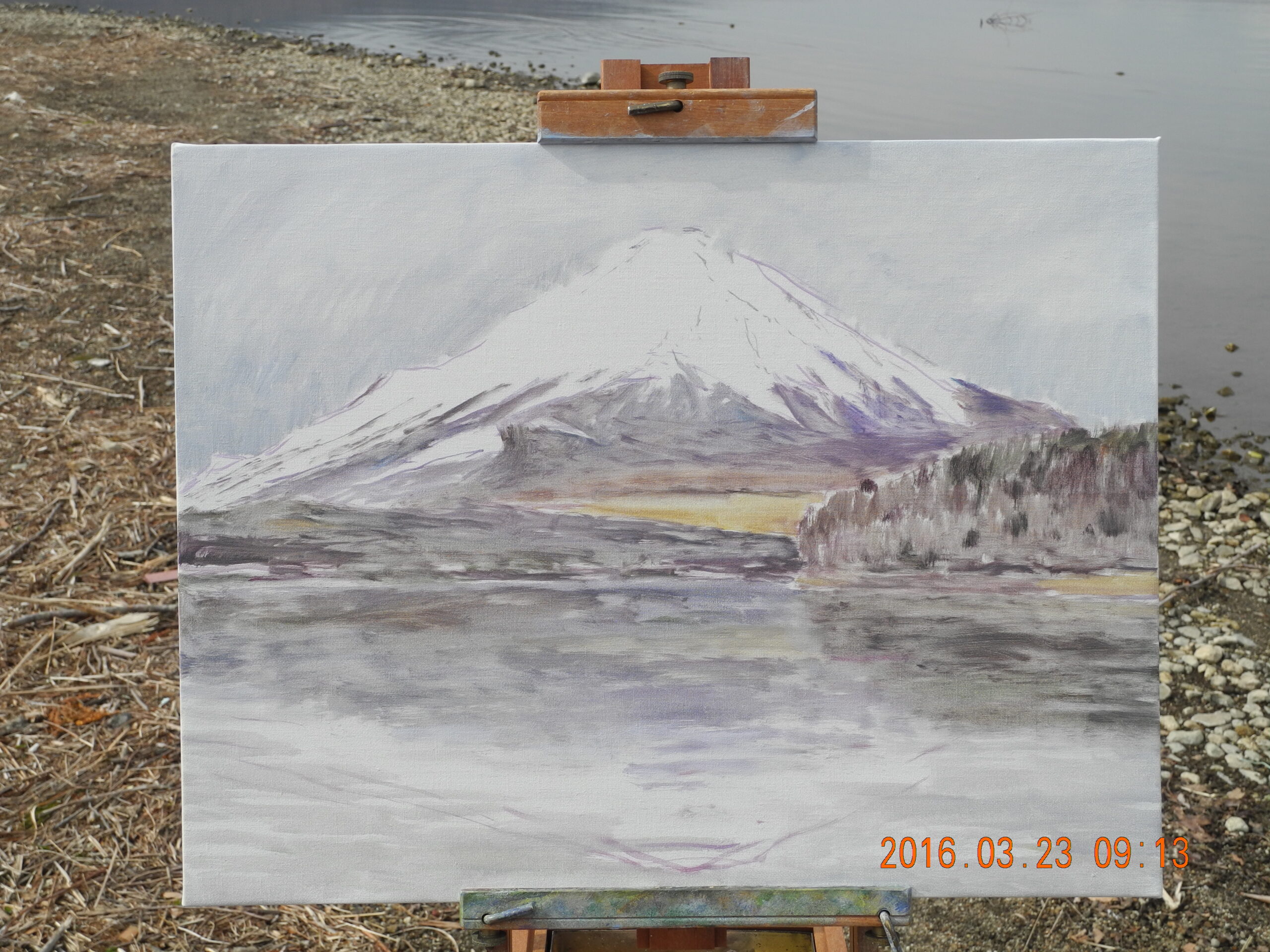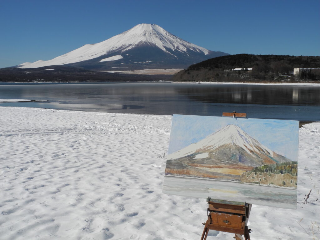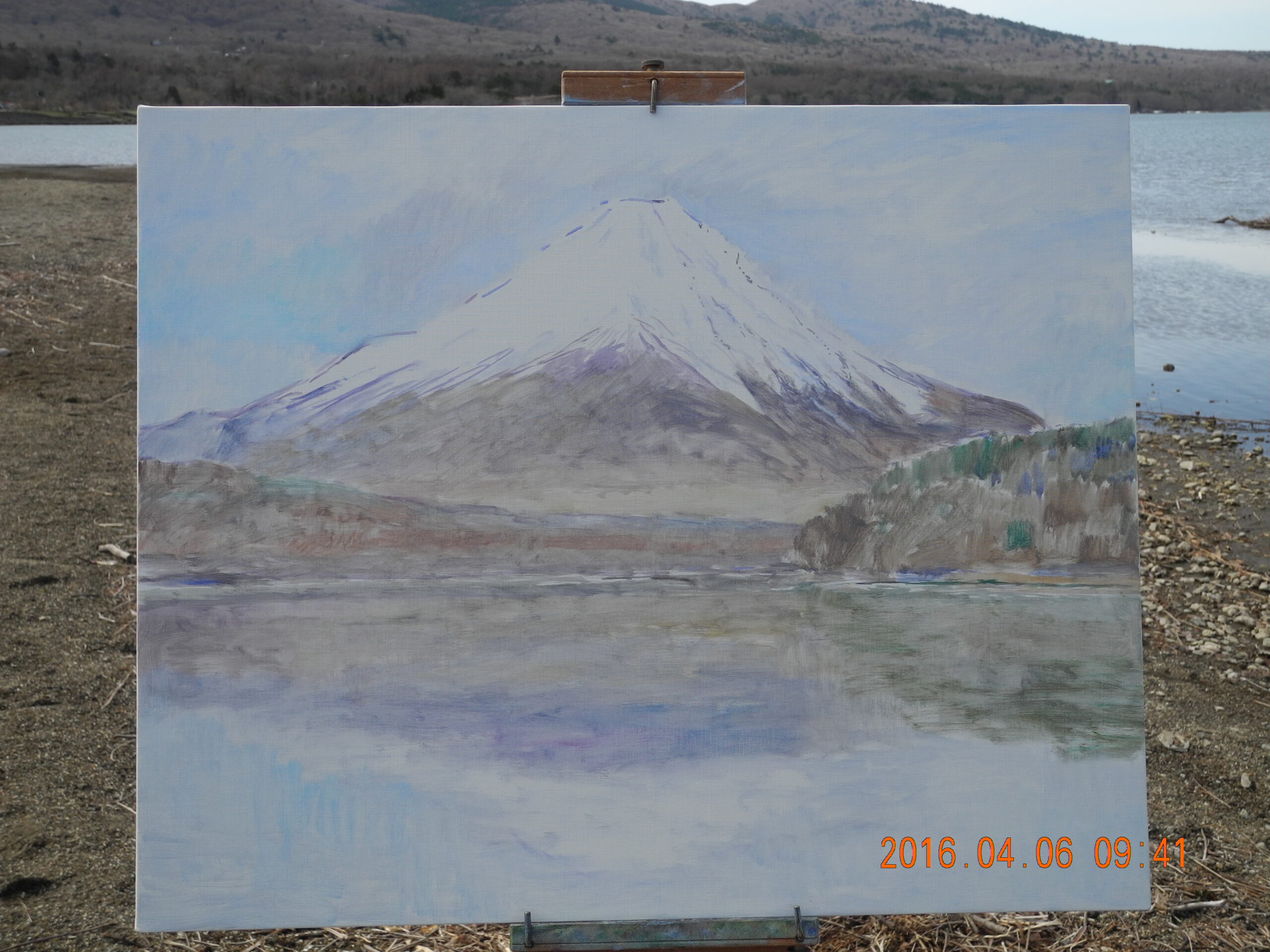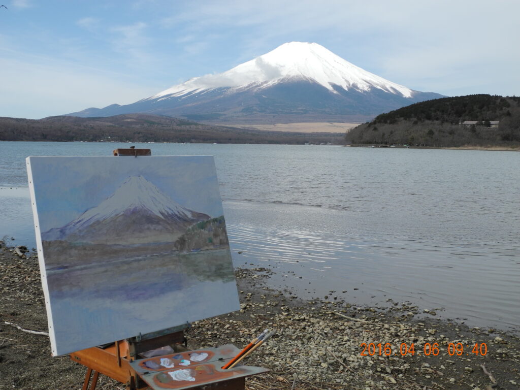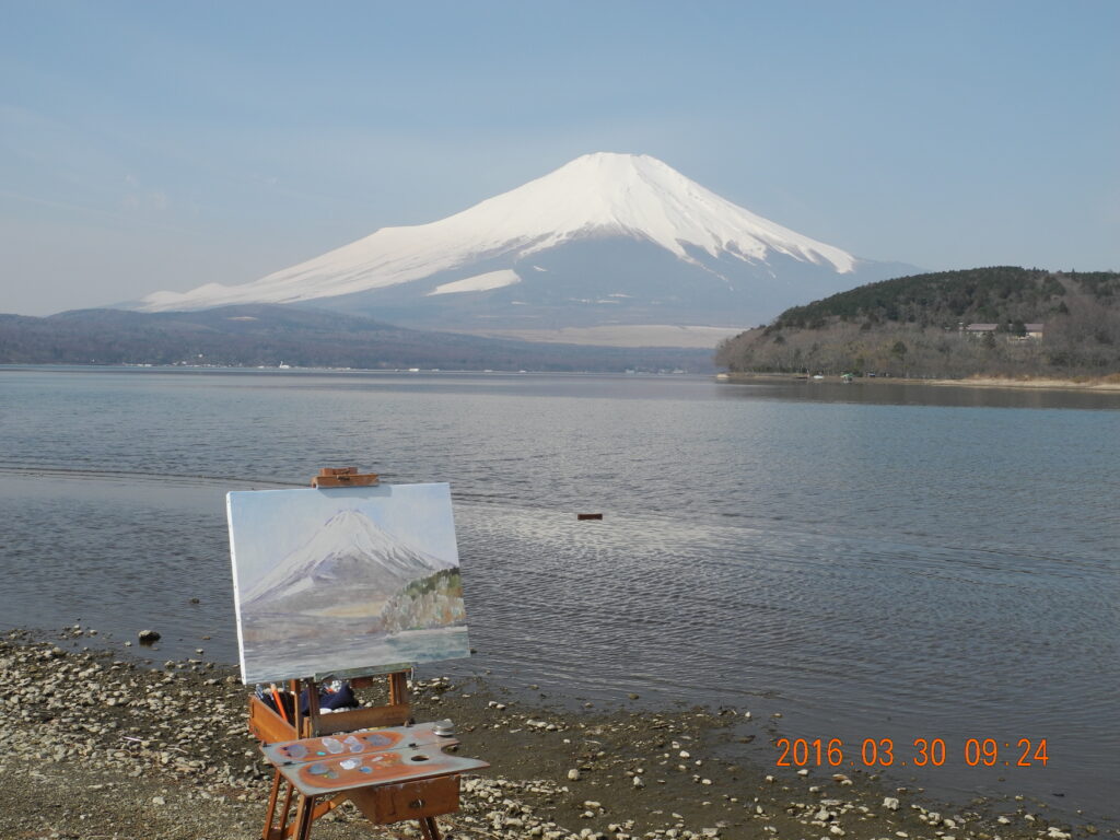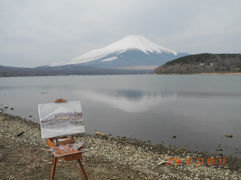 現場に立って、興奮した。風が無く、湖面全体に逆さ富士が写っているのだ。嬉しくなって、P10号のキャンバスに急いで筆を走らせ、そして、写った逆さ富士の状態のいい時の、湖面の写真を撮っておく。なにしろ、湖面の状態は、風や舟の波紋ですぐに変化してしまう。私が山中湖の逆さ富士に出遇ったのは、昨日が初めてだったが、部分でなく湖面全体が鏡のような逆さ富士は、これはもう滅多にないできごとであろう。