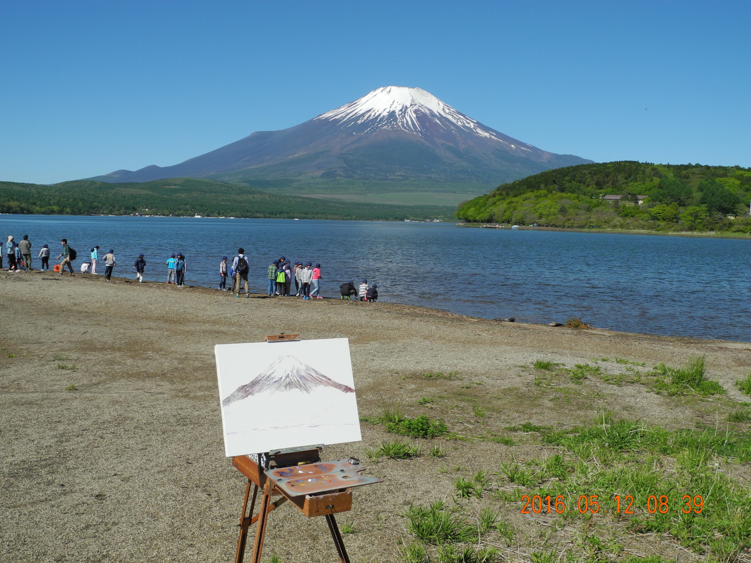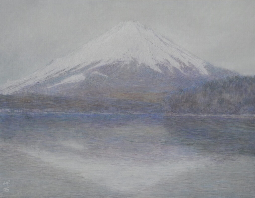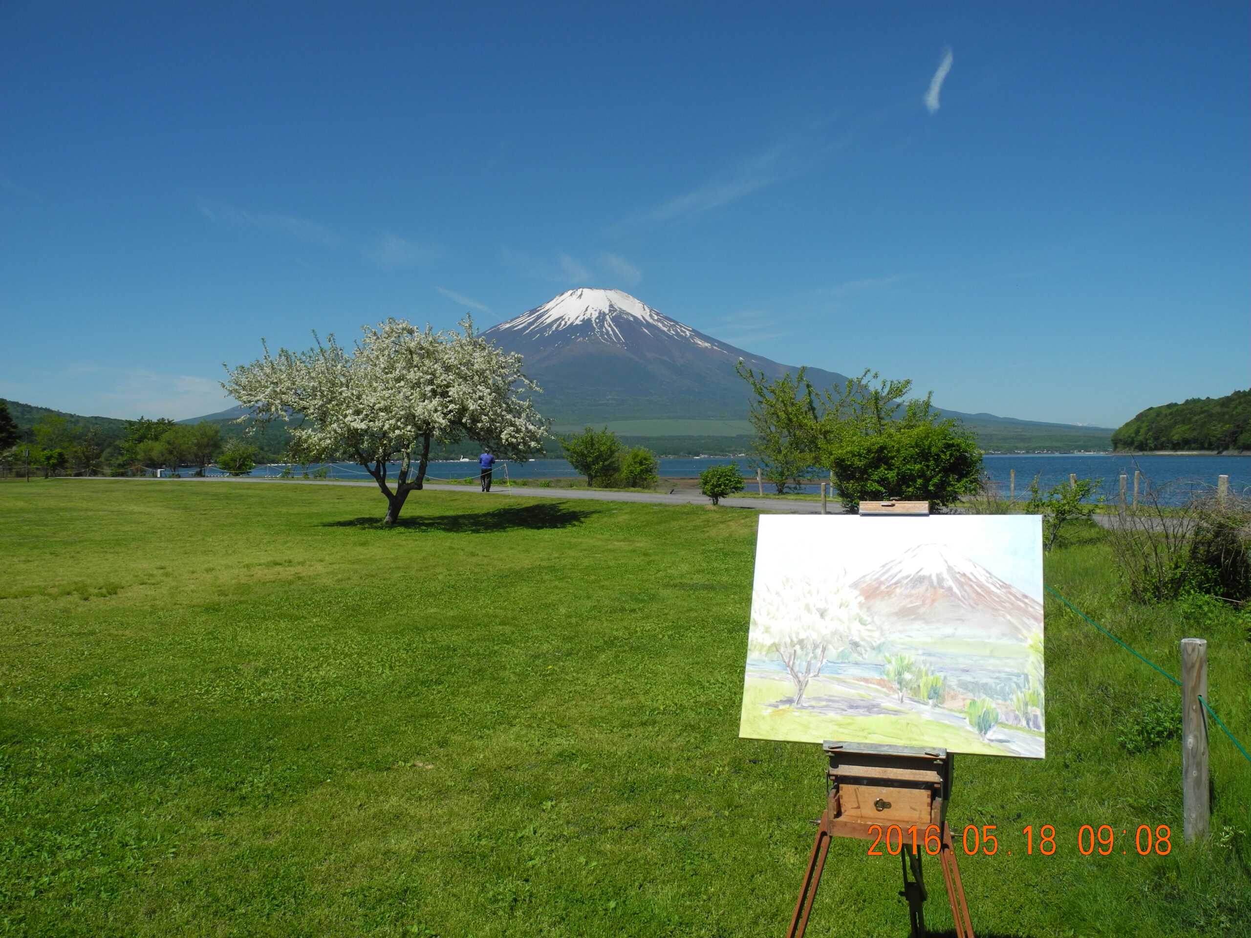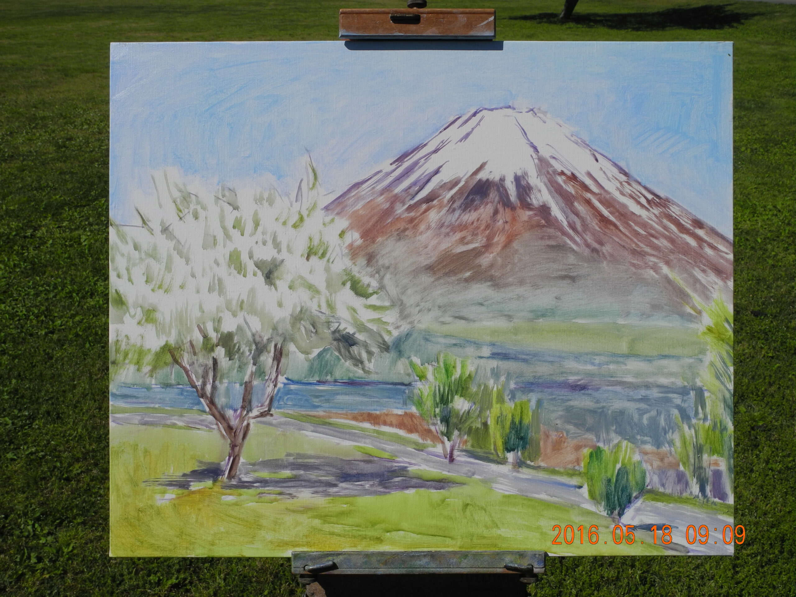 現場に立って、興奮した。風が無く、湖面全体に逆さ富士が写っているのだ。嬉しくなって、P10号のキャンバスに急いで筆を走らせ、そして、写った逆さ富士の状態のいい時の、湖面の写真を撮っておく。なにしろ、湖面の状態は、風や舟の波紋ですぐに変化してしまう。私が山中湖の逆さ富士に出遇ったのは、昨日が初めてだったが、部分でなく湖面全体が鏡のような逆さ富士は、これはもう滅多にないできごとであろう。