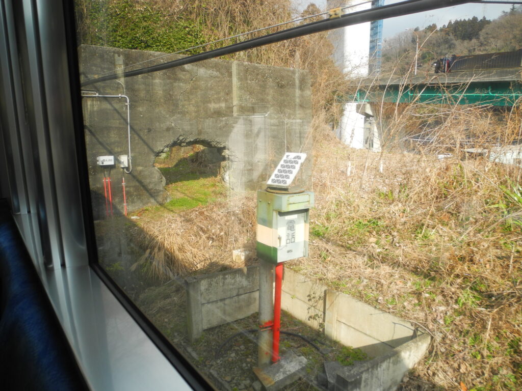 何度か、通っているのに、2本ずつあるトンネルが、どうしても1本見付からない。それが、今年になって偶然見付かり、1月28日の帰柏の車窓からデジカメで写した。駿河小山駅から谷峨駅に向かって最後のトンネルで、このトンネルの駿河小山向きの口が、離れたところにあり、上りの方向から一瞬しか見えないし、谷峨寄りの口が今のトンネルの隣りにあって、おまけに、それがコンクリートの目隠しがされてあるのだ(ネットで検索してみると、戦時中重要な通信基地が廃トンネル内に設置されていたためらしい)。そして、そのトンネルを谷峨駅から駿河小山駅に向かって出て酒匂川の対岸に別れ、再び離れた橋台の跡を渡って、同じルートに合流していたのだ。これを、見付けた時は、スっとした。心の中で小さなガッツポーズがでたネ。