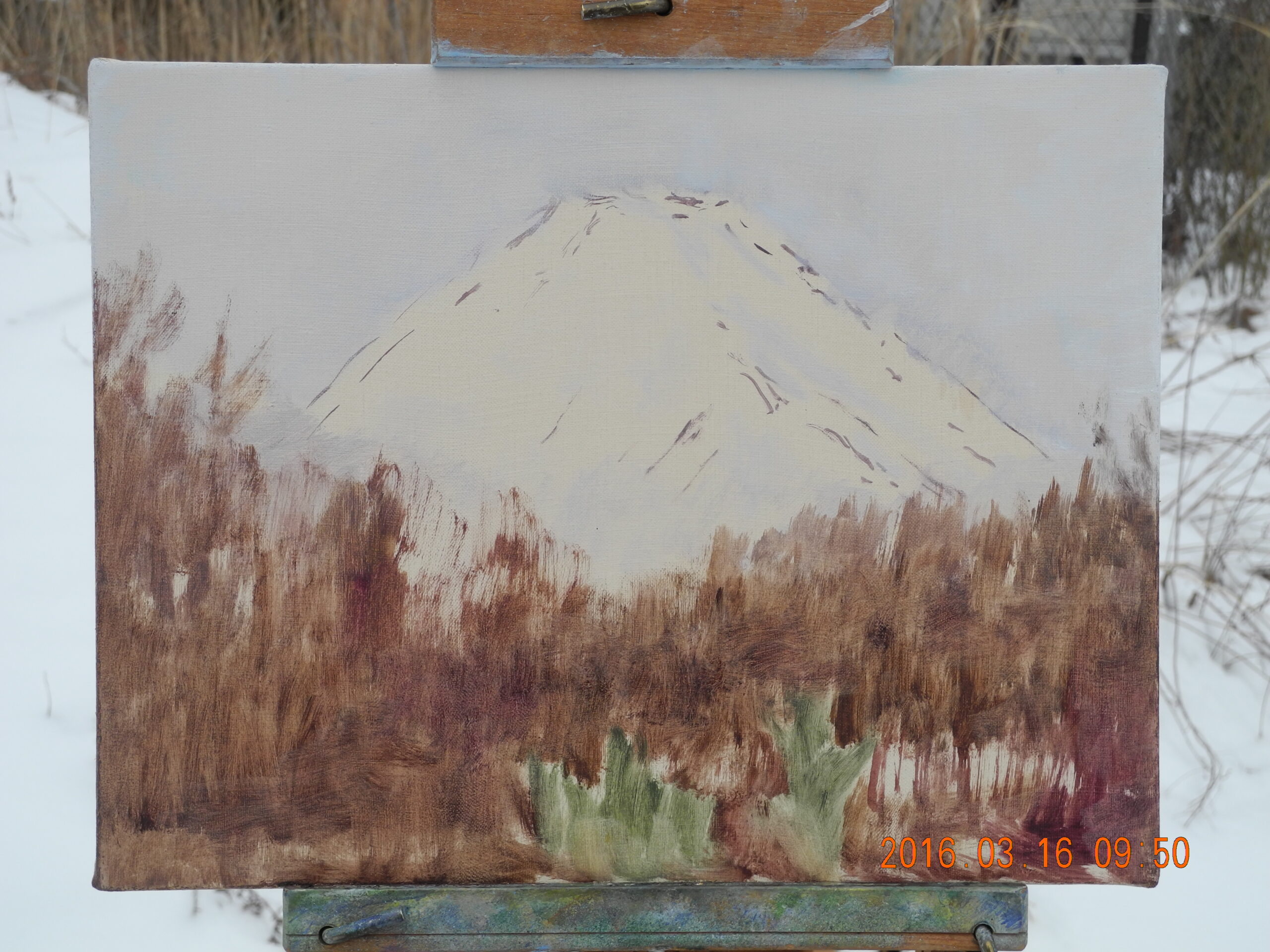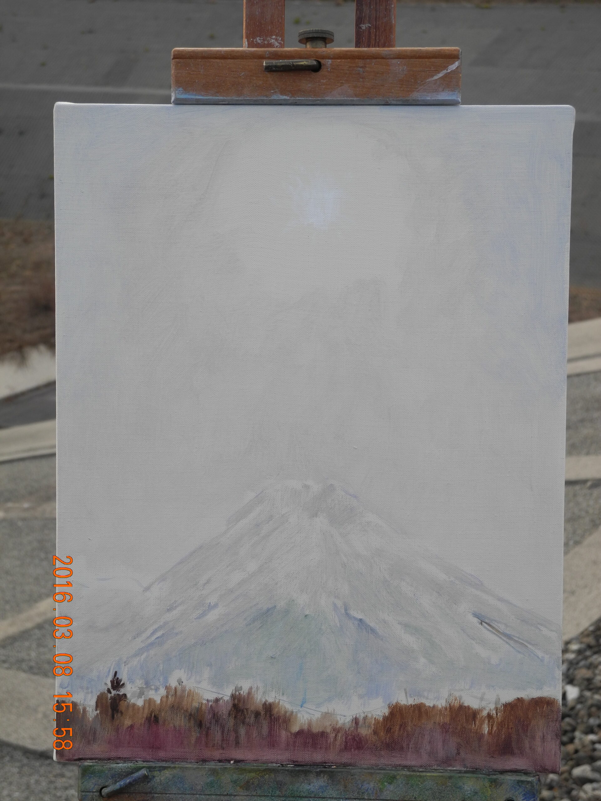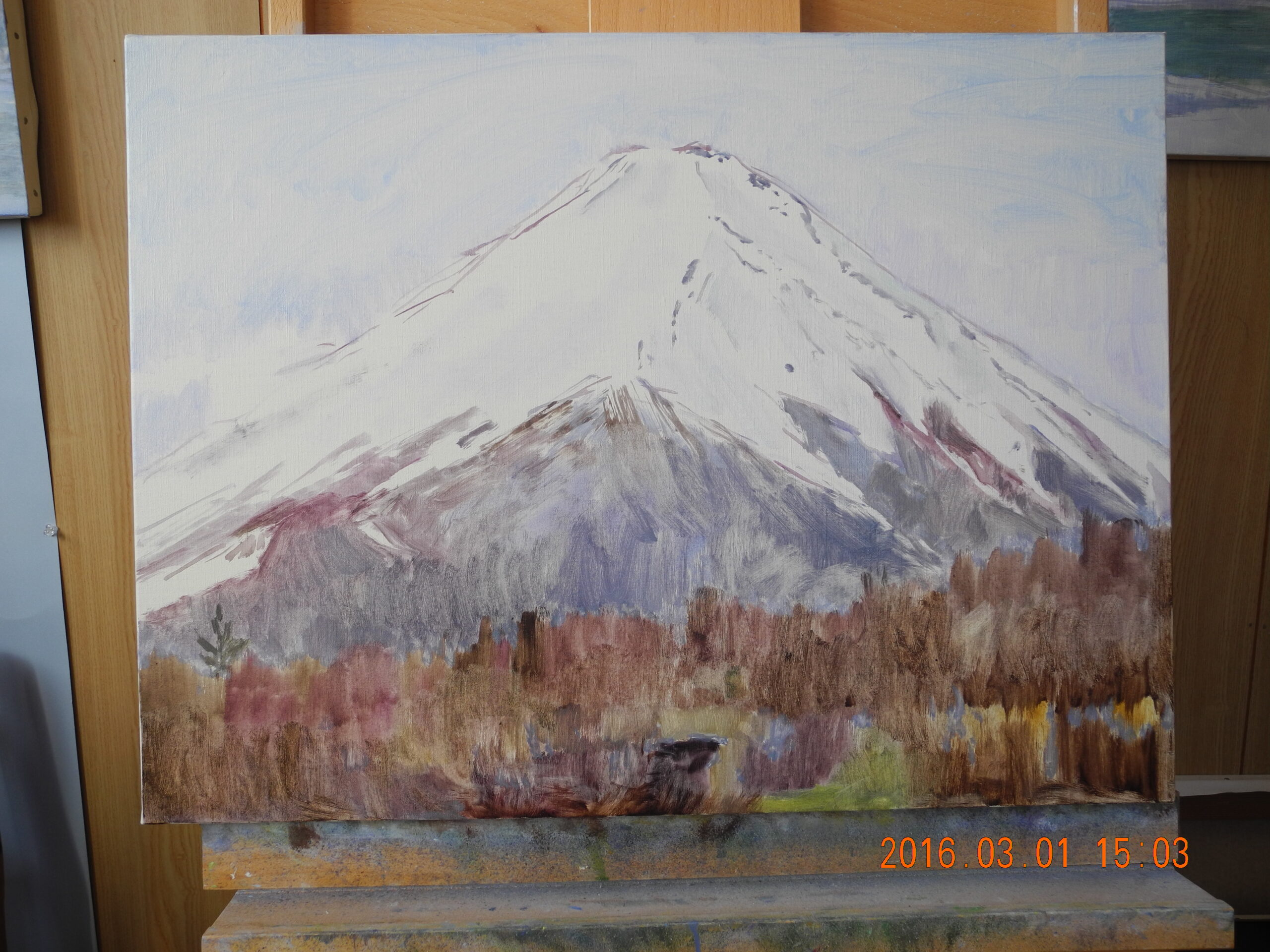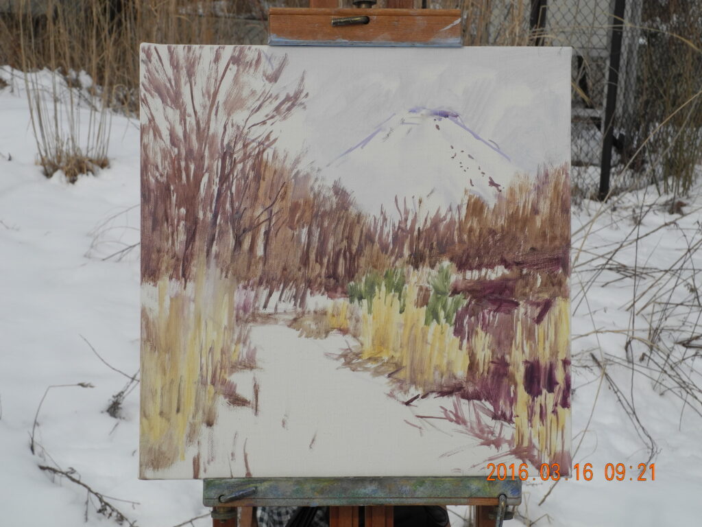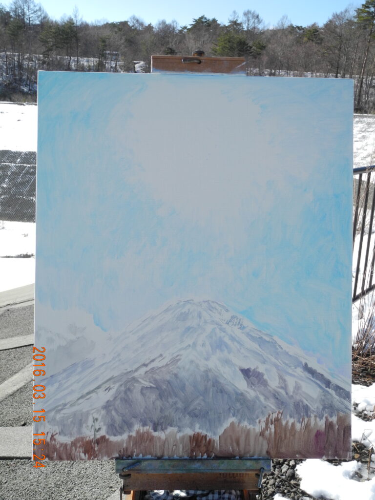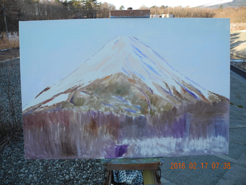 青色は、緑に向う方向と、紫に向う方向ががあるのだが、この時の空の色は、青紫だから、バジターブルー+ホワイトで描く。冠雪は太陽の位置で、大沢崩れの影が、早朝の陰影と違ってほとんど見えない。裾野も、青紫のトーンでディテールがとび、手前の冬木立も逆光ぎみでディテールの調子が単調で描きやすい。なんだか、思いのほかいい絵になりそうだ。