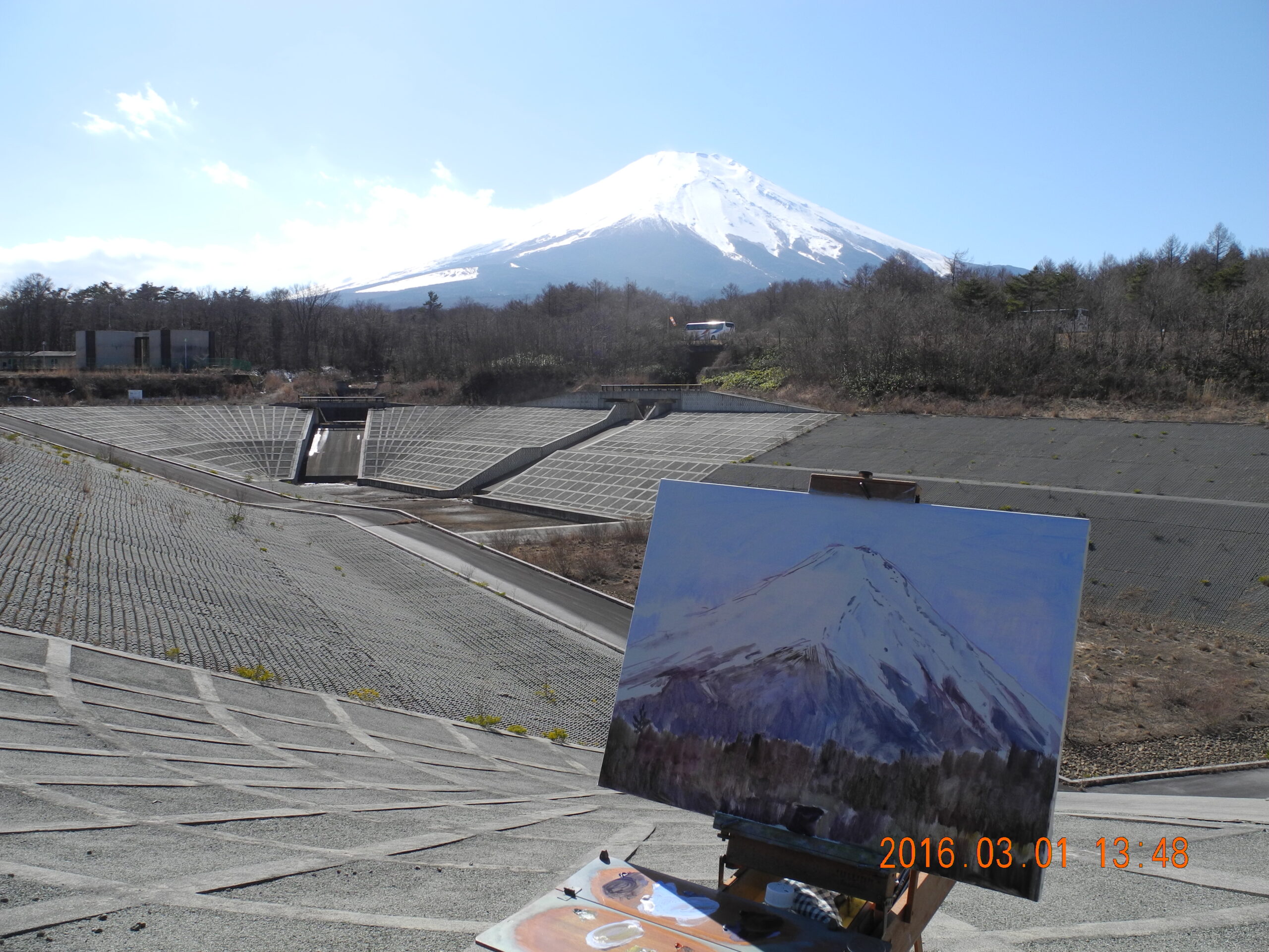 翌日は薄曇りの空で、山頂が出たり隠れたりで、アヤシ気な天気だった。S4号とF5号のキャンバスを合せて、調節池の周りの、雪の残る(15日の雨は、山中湖では雪だった)道と富士をねらって、山頂が出なければ、その時はその時で、考えればいいやと出かけた。前日1点描いたので、余裕がある。S4号で描き始め、富士山頂の部分が、見え隠れしていたが、後半、雲が切れて全貌を現わす。描き終えても、まだ山頂が顔をだしているので、F5号のキャンバスも絵具で埋めた。