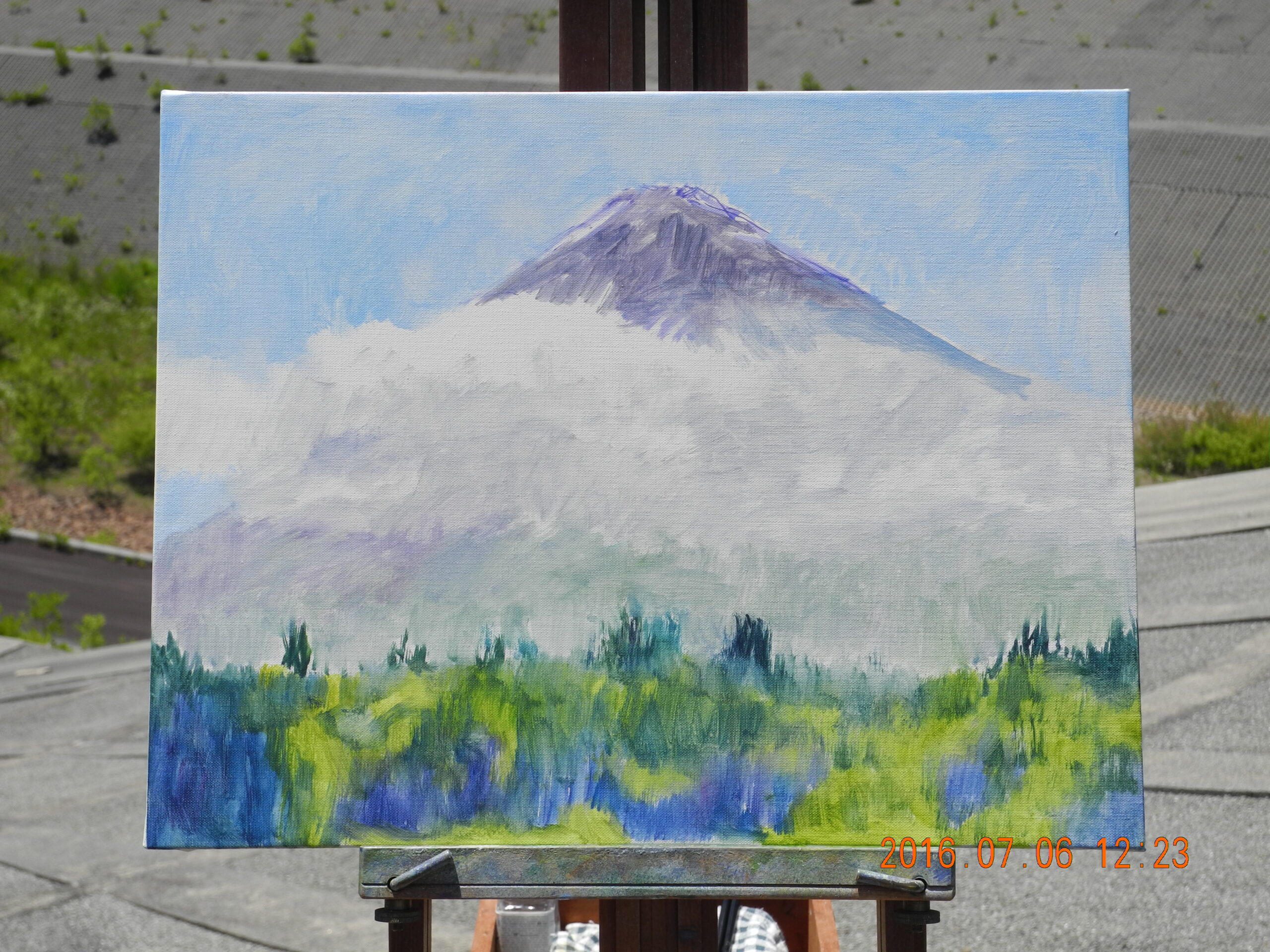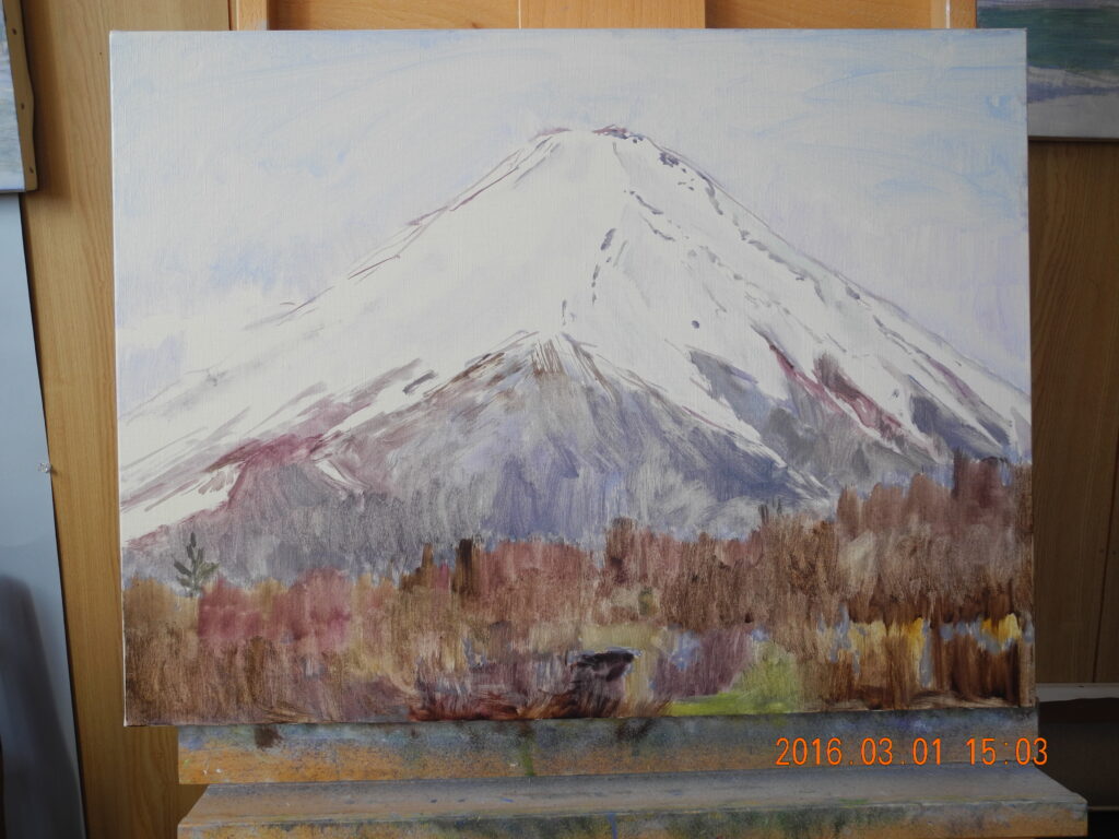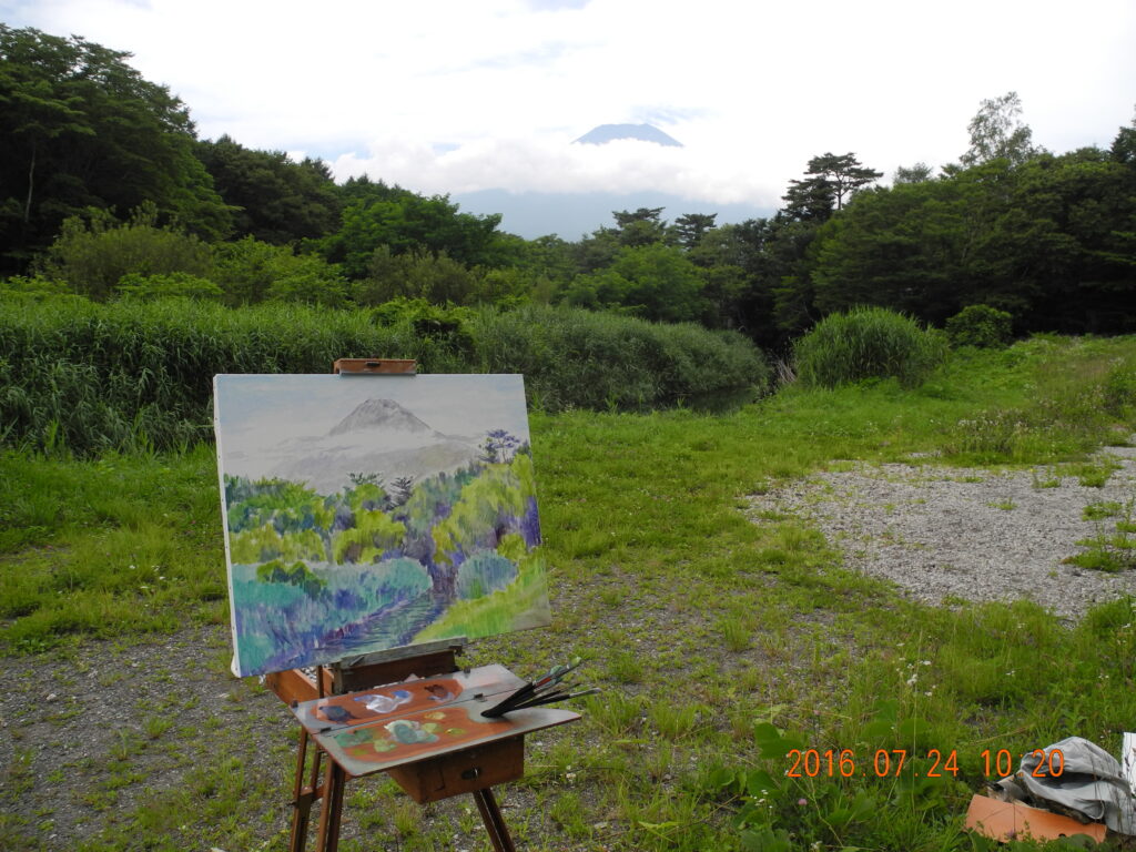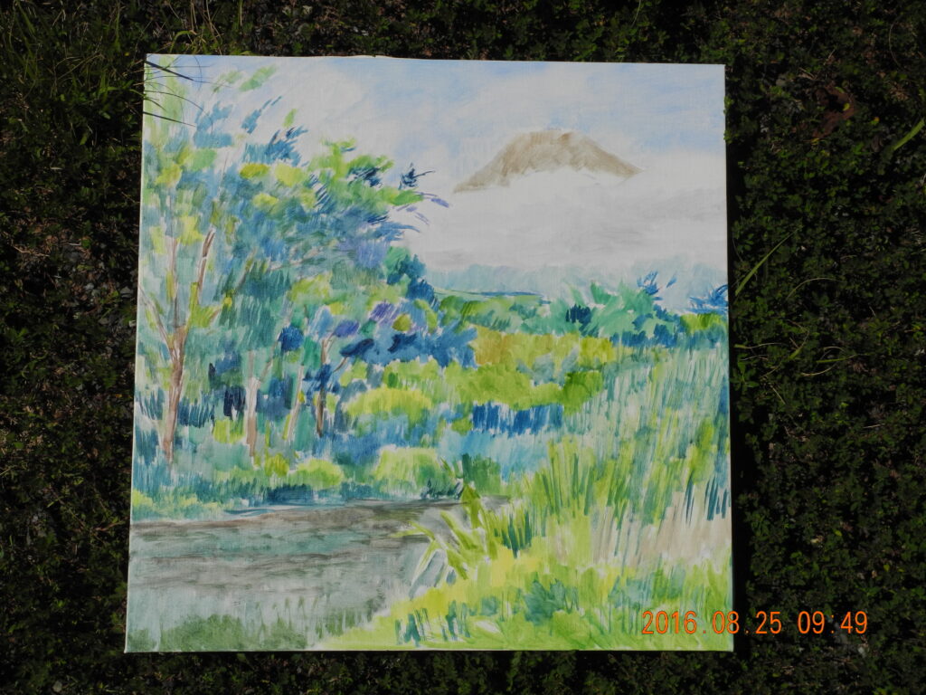 翌日(2日)は、今回の山中湖行で、朝の富士山をM20号で描こうと、キャンバスを張って予定していたのだが、天気は晴れだが、山頂が雲に隠れ、一日アトリエで過ごす。前日、1点描いておいて良かった。