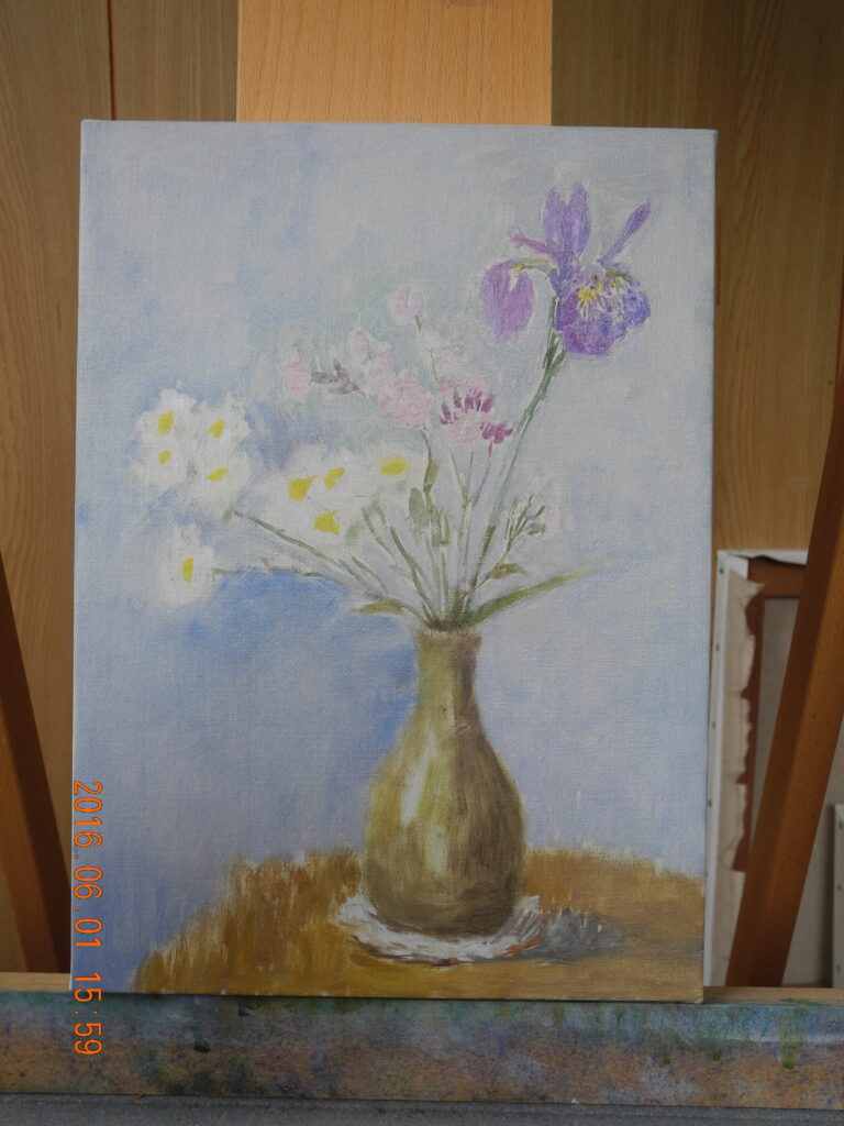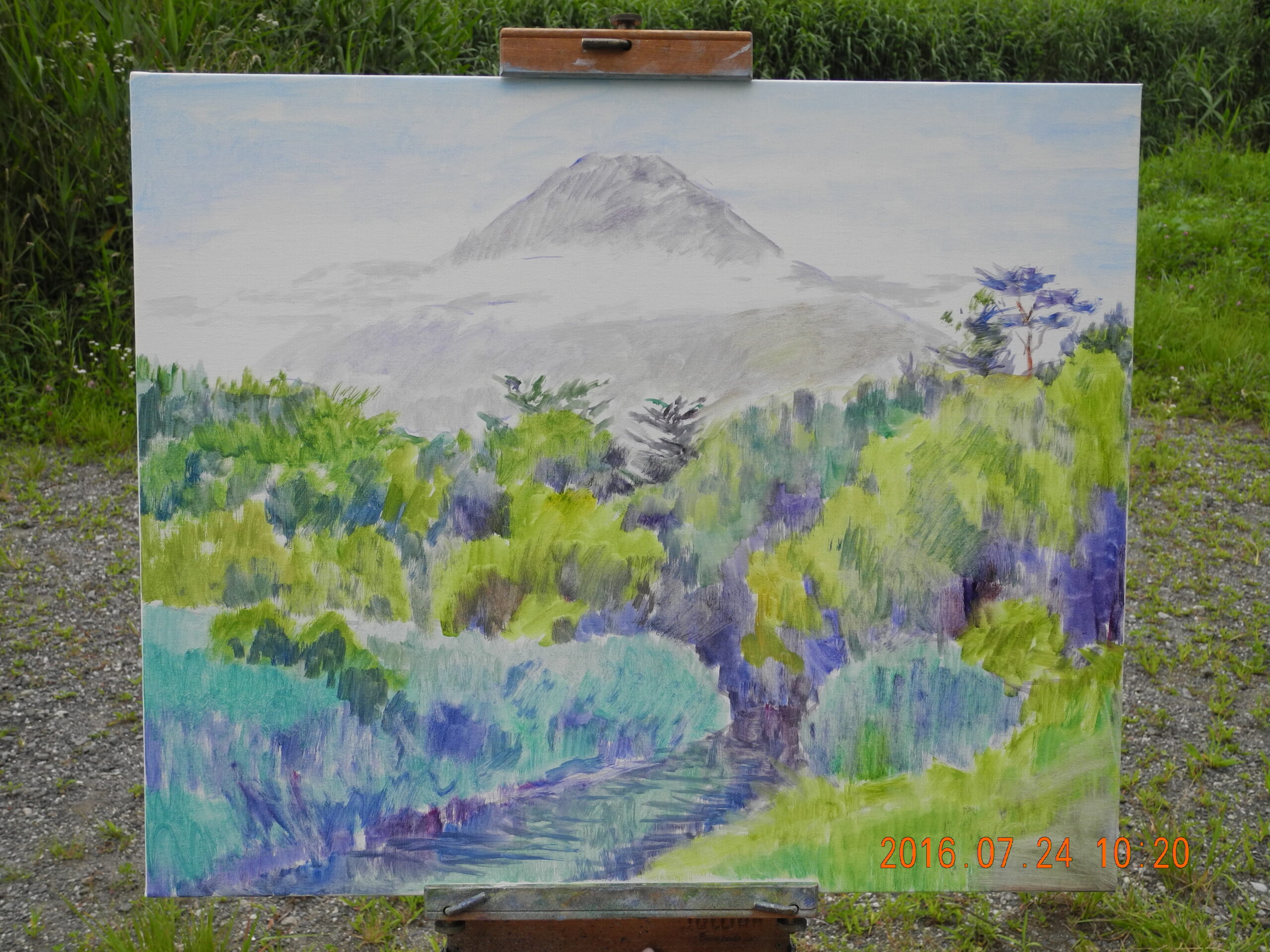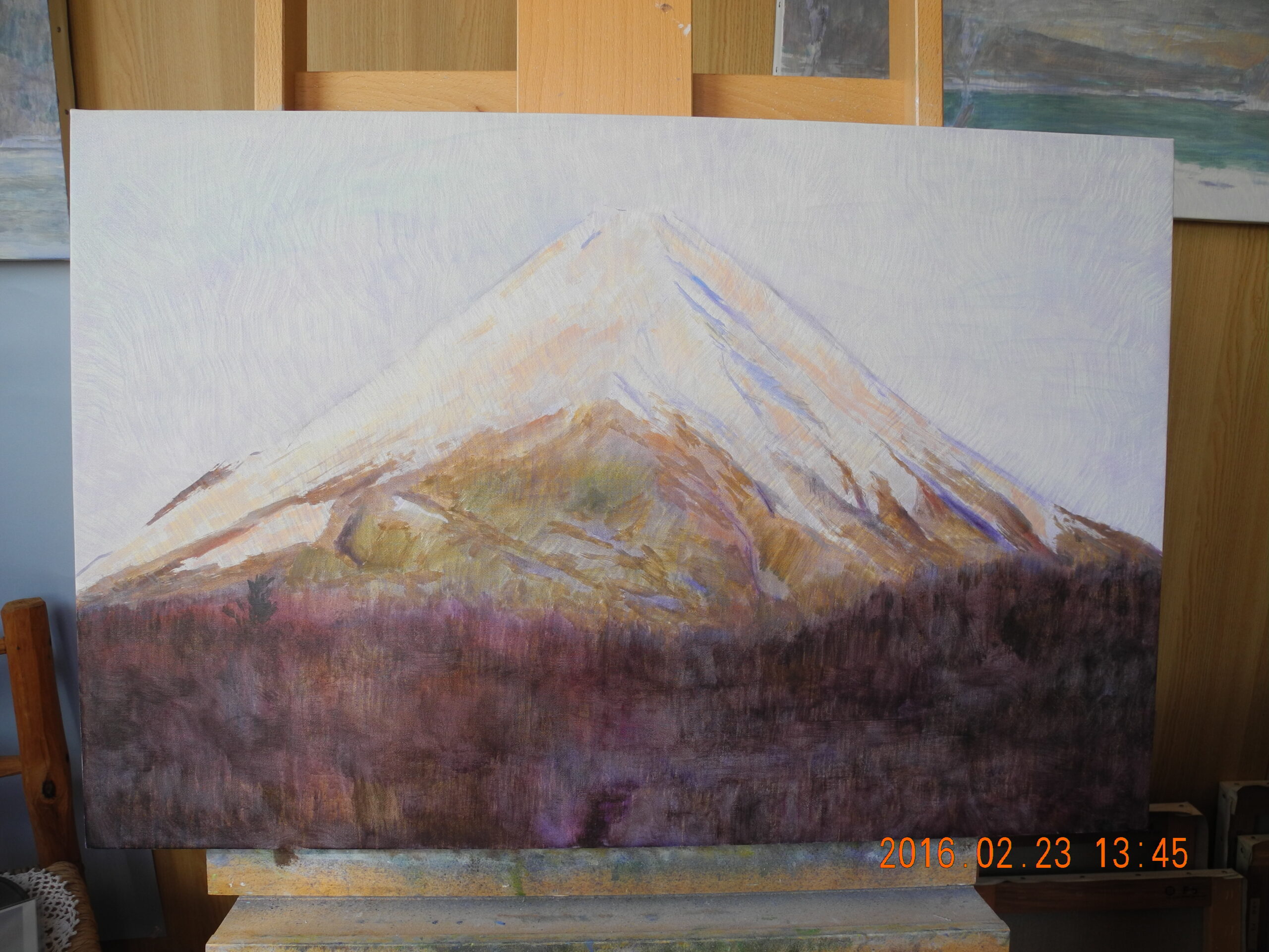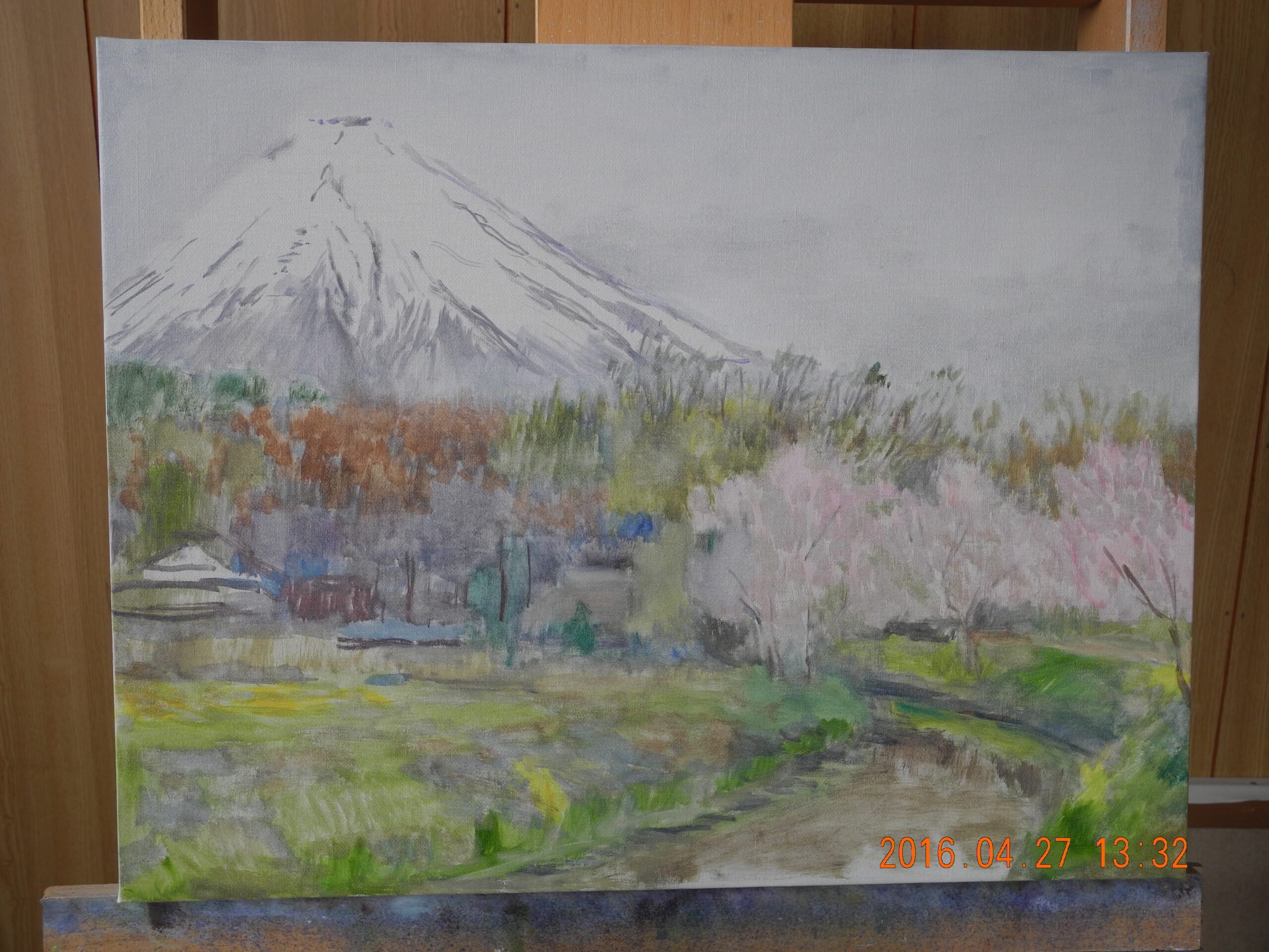 翌日(2日)は、今回の山中湖行で、朝の富士山をM20号で描こうと、キャンバスを張って予定していたのだが、天気は晴れだが、山頂が雲に隠れ、一日アトリエで過ごす。前日、1点描いておいて良かった。