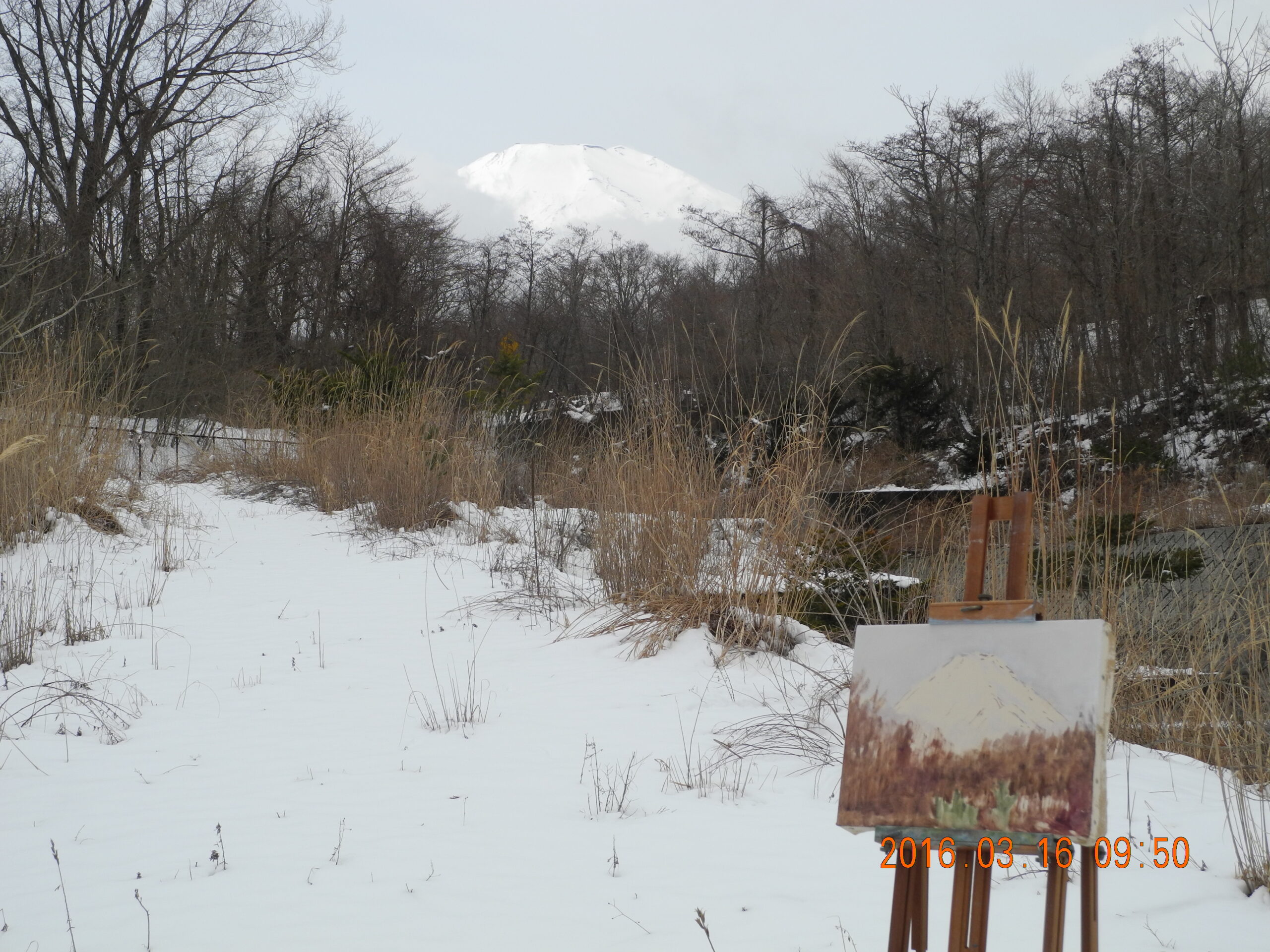 その日(2日)、太陽が山頂の真上に来る頃(3時半頃)雲が消えたので、アトリエ裏の伐採地で、写真だけ撮っておいた。このシチュエーションの富士山を、調節池で描こうと思っているが、イーゼルを立てる機会が、前景が冬木立の間に、間に合うだろうか。この日も、一瞬、調節池に行くのが、頭をよぎったのだけれど、少し雲が消えた時間が遅すぎたのと、その前に、アトリエで途中の絵に集中していたので、現場に出かける気力が湧かなかった。