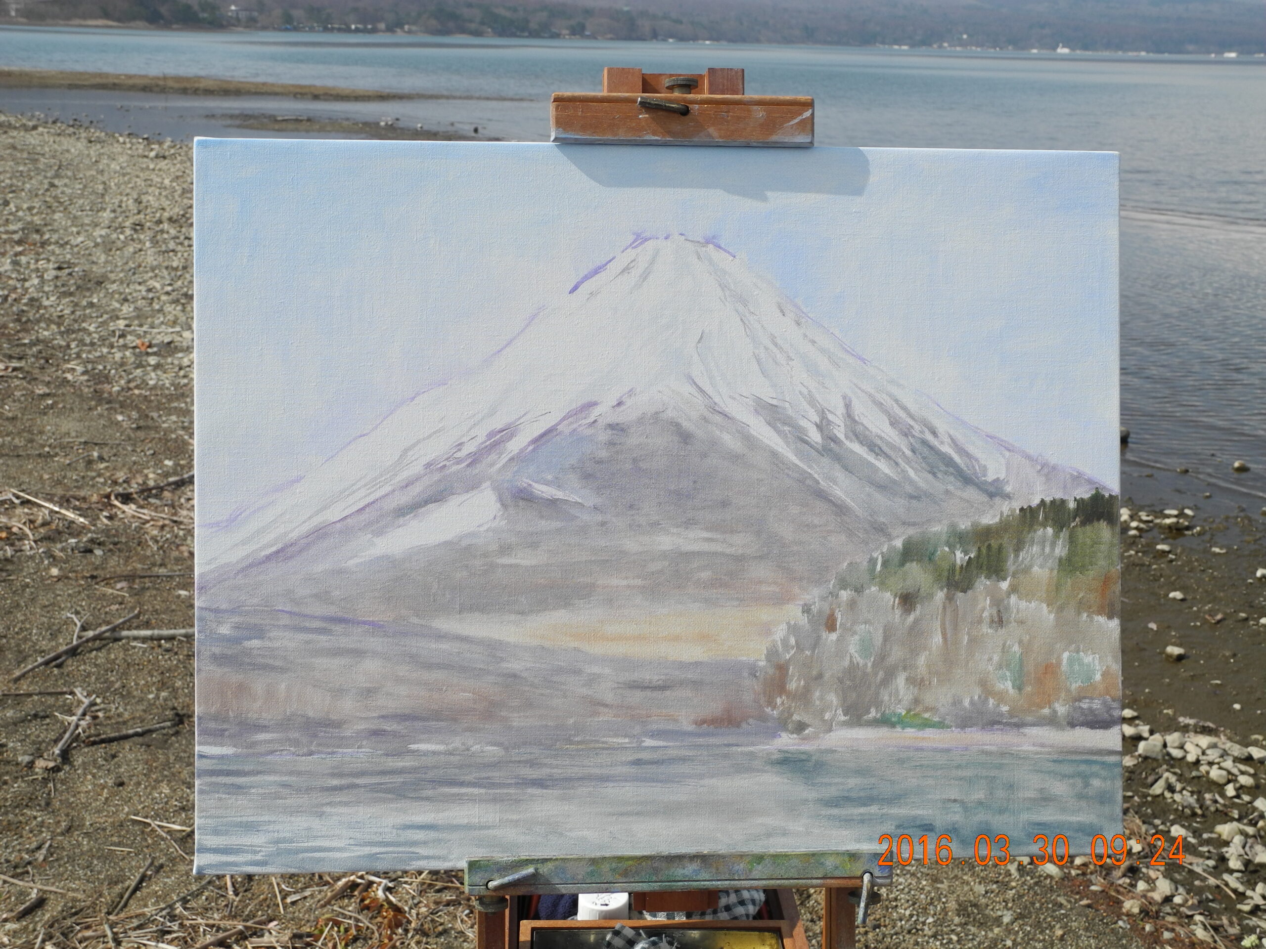 今回の山中湖行は、29日から今日(31日)まで山中湖村で過ごした。昨日(30日)は先週と同じく、7時26分一の橋バス停通過の“道志小学校”行きのバスで平野浜に向かった。晴れてはいるが、春先の白っぽく霞んだ空で、それはそれで美しい。絵の後半から風が止み、時折逆さ富士が湖面に写る。P10号のキャンバスを持ってきたのだが、これならばもっと大きなキャンバスをもって来ればよかったと思ったのだが、近々(逆さ富士は、冠雪の白がポイントなので、雪融けで稜線が出る前に)来る時には、大きめの横長のキャンバスで、湖面が波立っていても、強引に逆さ富士が写った湖面を記憶で描こうとおもう。モネの睡蓮の絵と同じで、湖面より上の本体と、湖面に写った本体の像と、湖面の表面の空間が復層していて、描き甲斐のある状景だ。