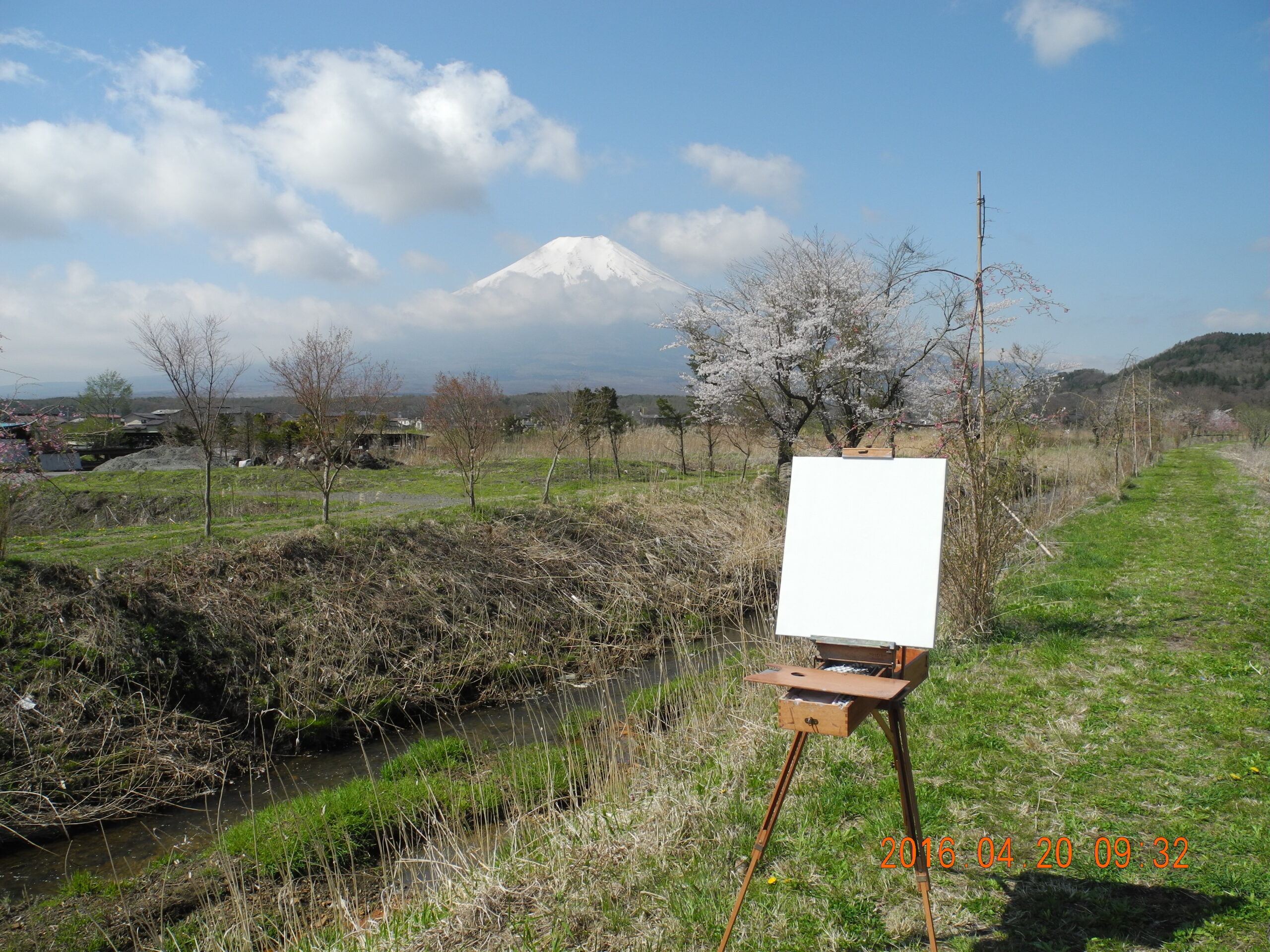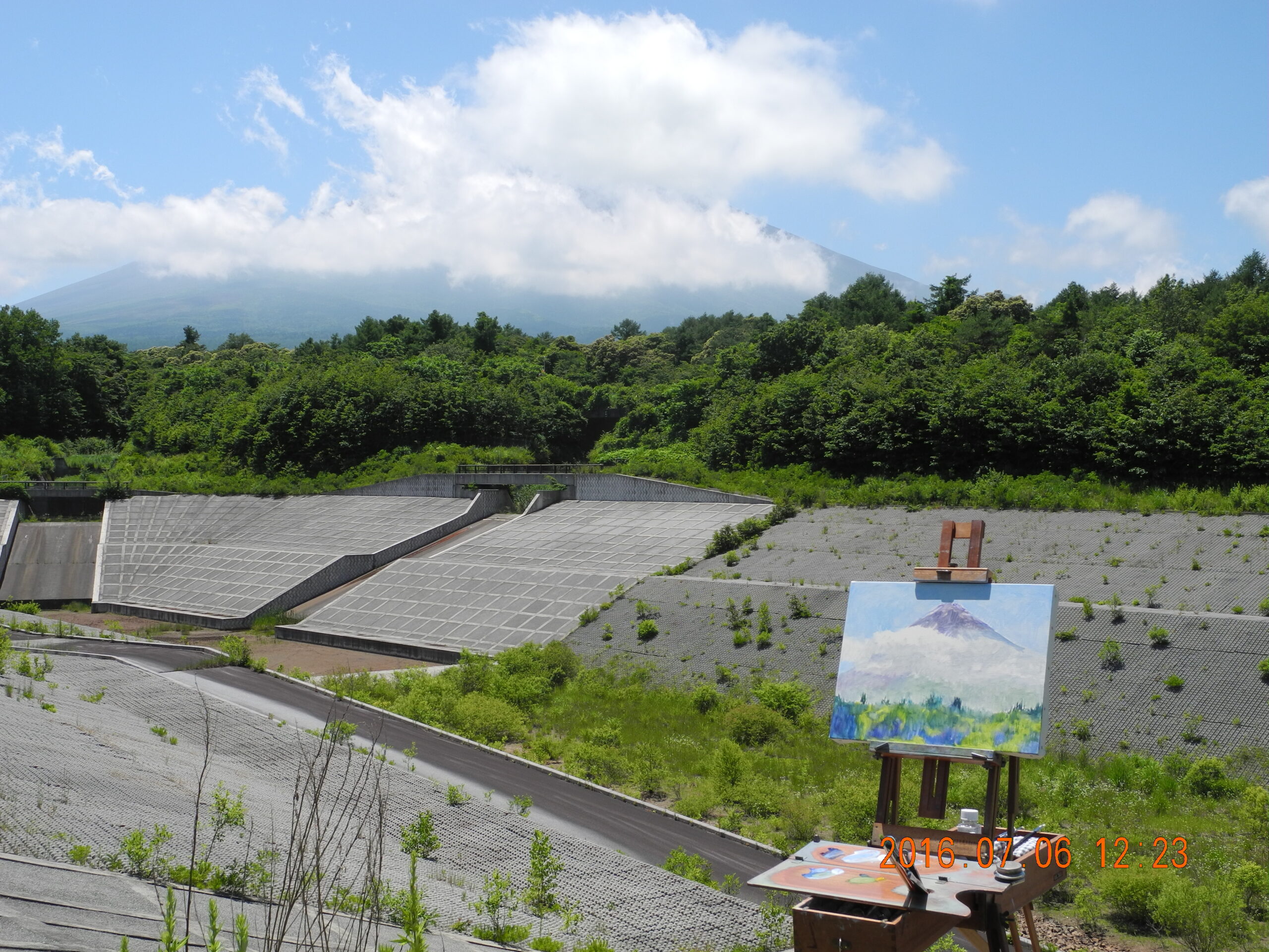 今回の山中湖行は、1日から今日(3日)まで山中湖村で過ごした。着いた日(1日)の昼頃、富士山があまりにも好条件の視界なので、急ぎ調節池に出かける。この時間に、富士山を描くことは珍しいので、同じ所で描いても、新しい発見があって何度描いてもイーゼル画は楽しい。