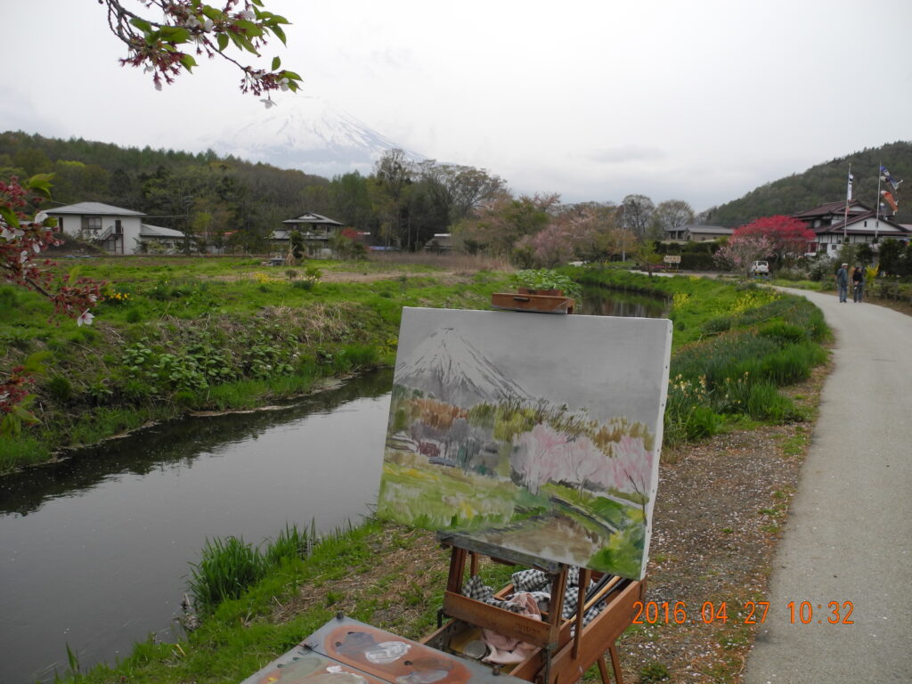 今回の山中湖行は、19日から今日(21日)まで山中湖村で過ごした。高速バスで山中湖に来る時に、途中通過する忍野(おしの)村の桜が見頃だったので、アトリエ近くの、フジ桜(マメ桜)を描く予定を変更して、昨日(20日)は、ふじっこ2号のバスで忍野村に行き、イーゼルを立てた。以前、一度、自転車でロケハンに来ていたので描く場所の見当はついていて、往きはよかったが、忍野八海の周りの道は複雑で、帰りには迷ってしまった。今日の上りの高速バス(高速バスとふじっこ号の路線が少し違う)の車窓から、忍野村でもう2個所ビューポイントを見かけたので、来週桜が散ってなく(散っていれば、葉桜になってから)、天気がよければ、地図を持って描きに来よう。条件が悪ければ、アトリエの近くのフジ桜(マメ桜)を描けばいいヤ。
