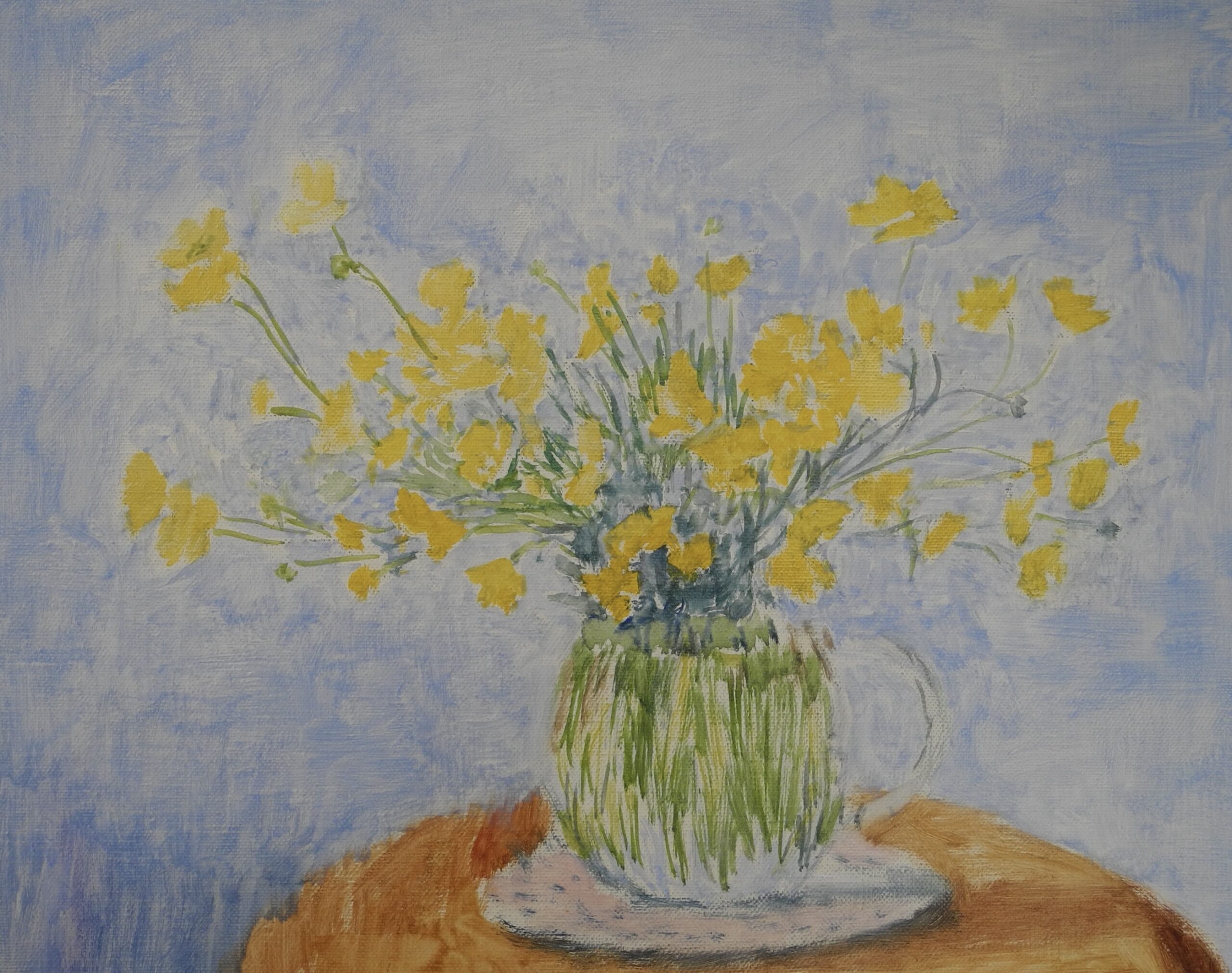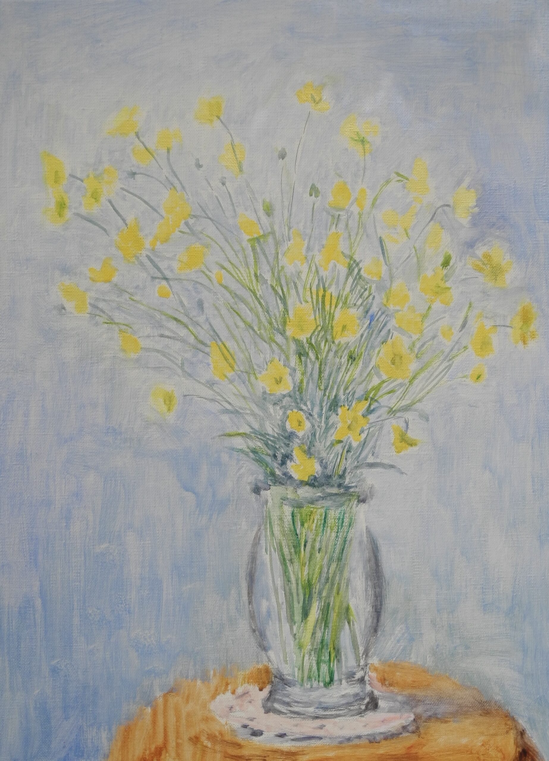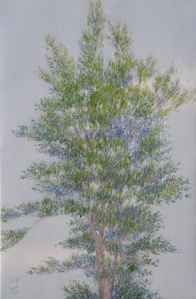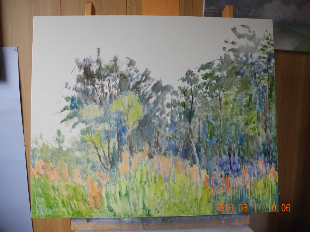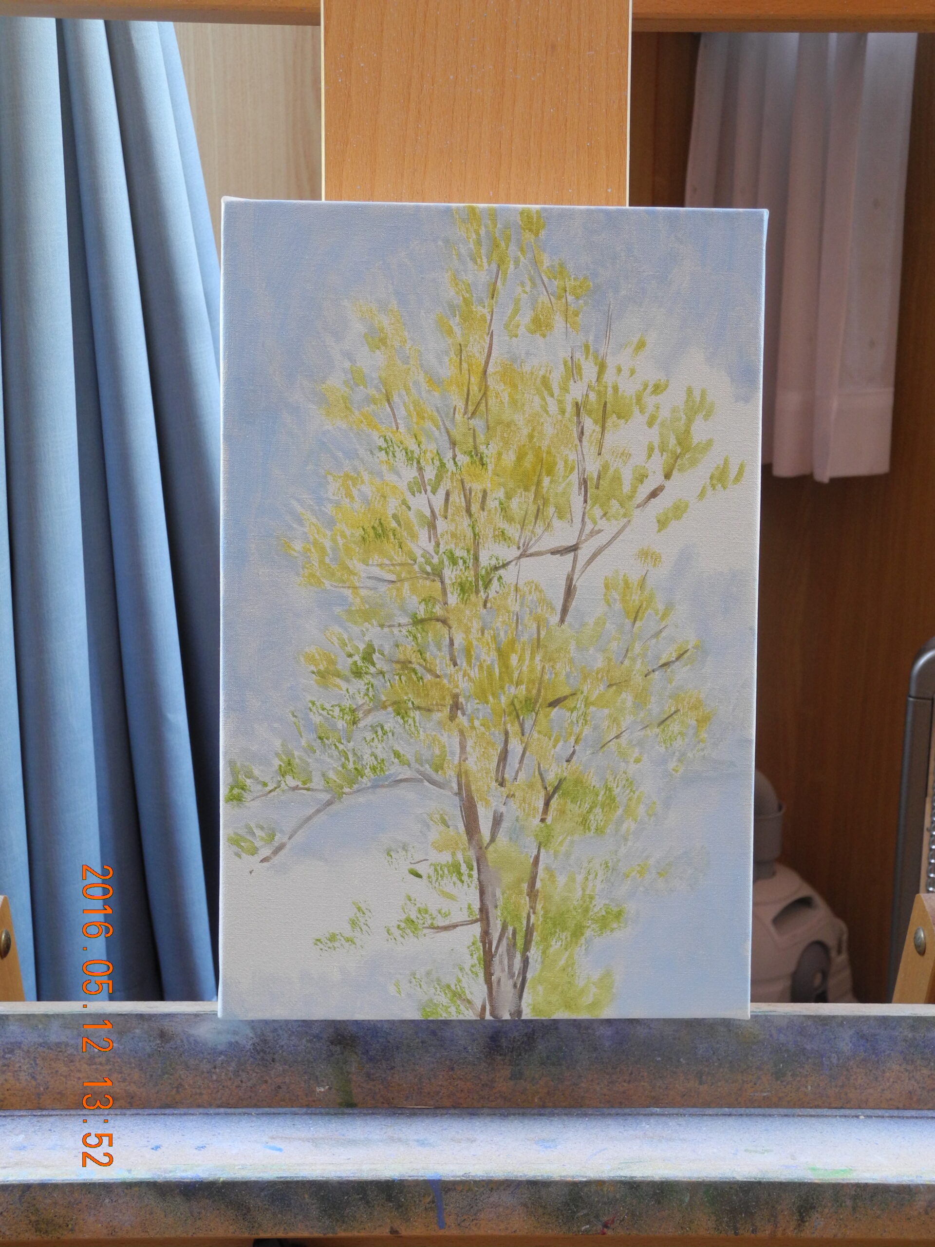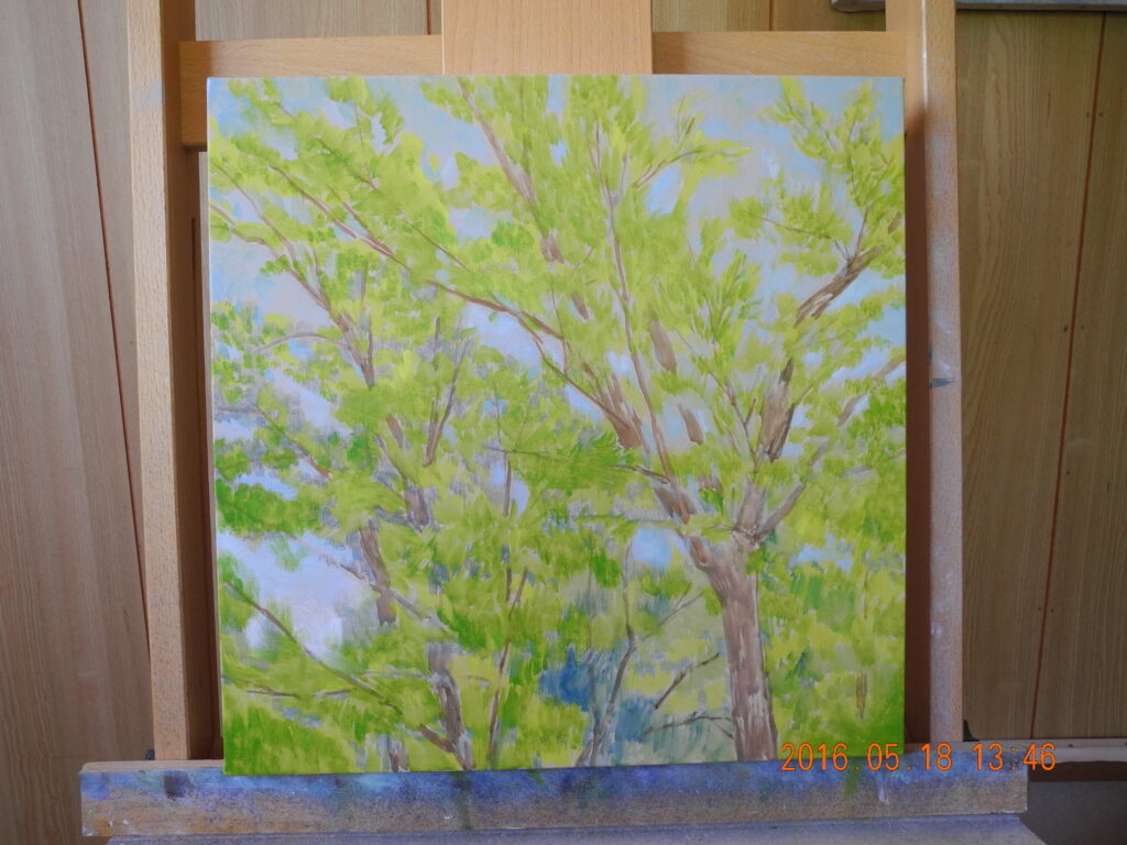 終って一服して窓の外を見ると、先週写真を投稿した、冬木立に当たった光がベストなので、急ぎ、M6号のキャンバスを張って、描いた。こちらの絵も、細い枝先と空をどうやって描くかが問題だが、そのスキルには、いまや自信を持っている。完成への過程で、ちゃんと出来るだろう。