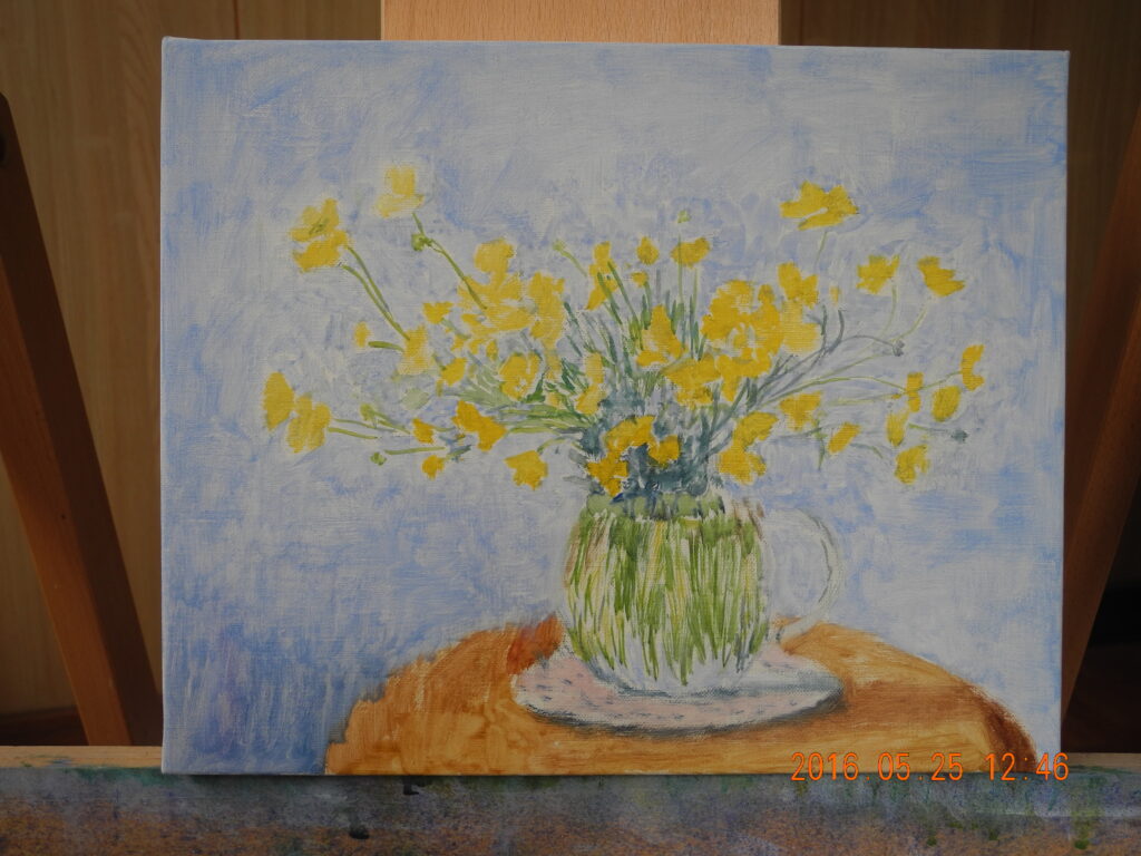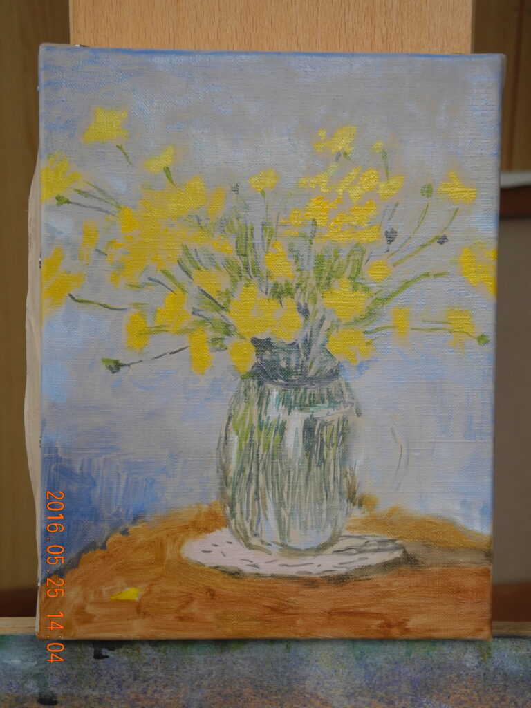 出る時に、ウエストポーチを着け忘れたので、現場の写真が撮れなかったので、アトリエに帰って、塗り残しを埋めた作品の写真を、載せました(ケイタイで撮れることを後で気付く)。
