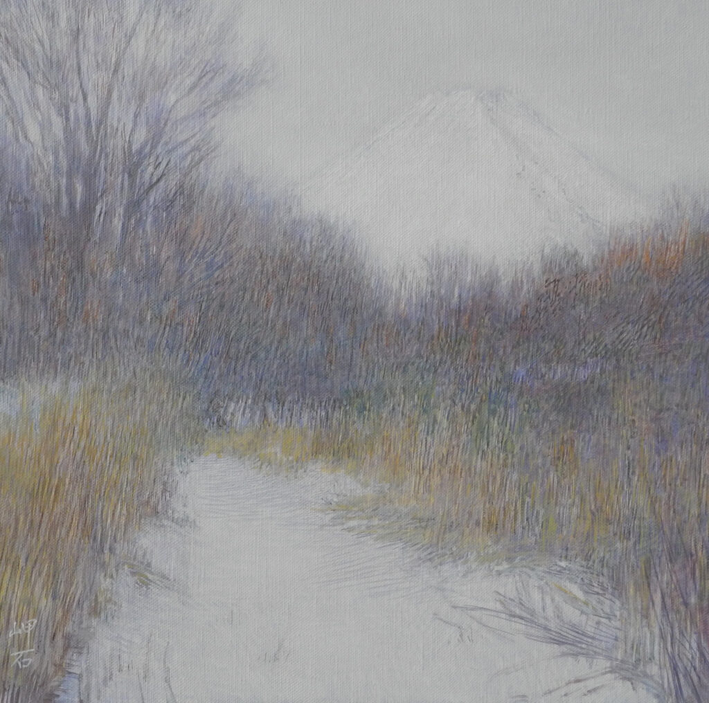 今回の山中湖行は、12日から今日(14日)まで山中湖村で過ごした。着いた日の12日は小雪。翌13日は、ゴミ出しがあったので、朝食後、いつもの時間より遅く、調節池に行く。途中の山中の山神社の祠に、初詣をして、お賽銭(500円硬貨が小銭入れに無かったので、千円札を奮発した)をあげてから、お礼をいった(何せ、数々の美しい光景を、モデル料タダで用意してくれるんだよ)。調節池のいつもの現場で、一旦イーゼルをセットしたのだが、晴れていても山頂は隠れて顔をだしそうもない雲がでているので、富士山を描くのは諦める。このまま帰ろうとしたのだが、まだ1度も描いたことはないが、目を付けていた途中の道に寄ってみたら、前日の雪と、時間が遅いぶん道に光が当たり、十分に画になる予感で、あらためてF12号の縦構図でイーゼルを立てる。冬木立の間の空は、現場で追うのは無理なので、アトリエに帰ってから、埋めた。