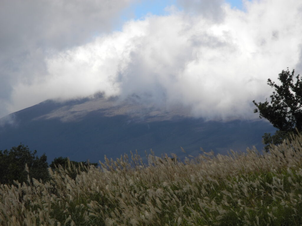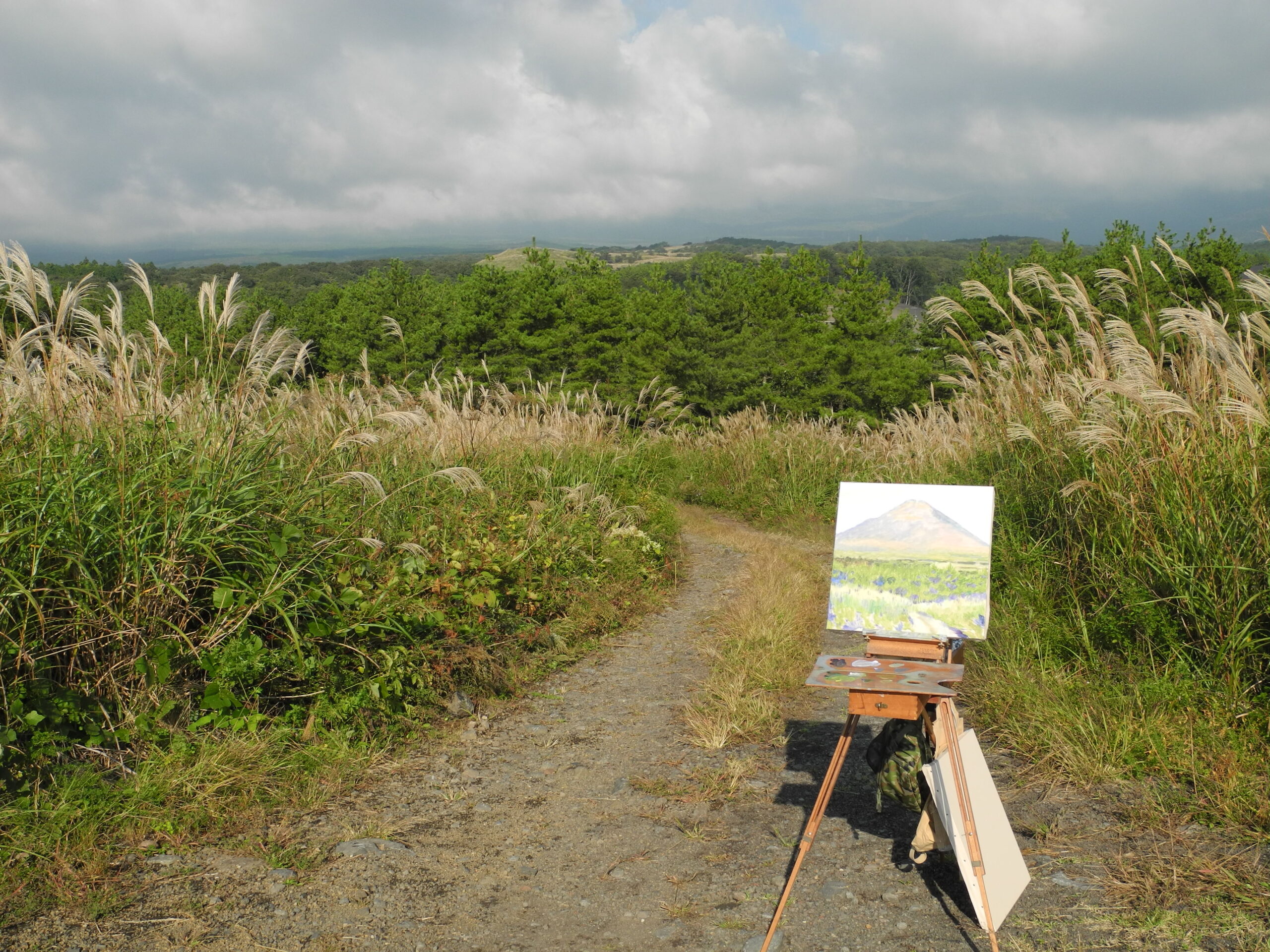 今週の御殿場行は、16日は台風で出られず、翌日の17日(今日)は台風一過を期待したのだが雲が多く、山頂は隠れたがほんの一瞬顔を覗かせた時になんとか画面におさめた。場所は、高塚道を少しづつ描き上がってきて、今までの最高点。この周りに描く場所はありそうなのだが、時間がたつと自衛隊の車が近くを通り、また駐車するので、遠慮しながらの描画になるし、イーゼルを立てる場所も限定される。