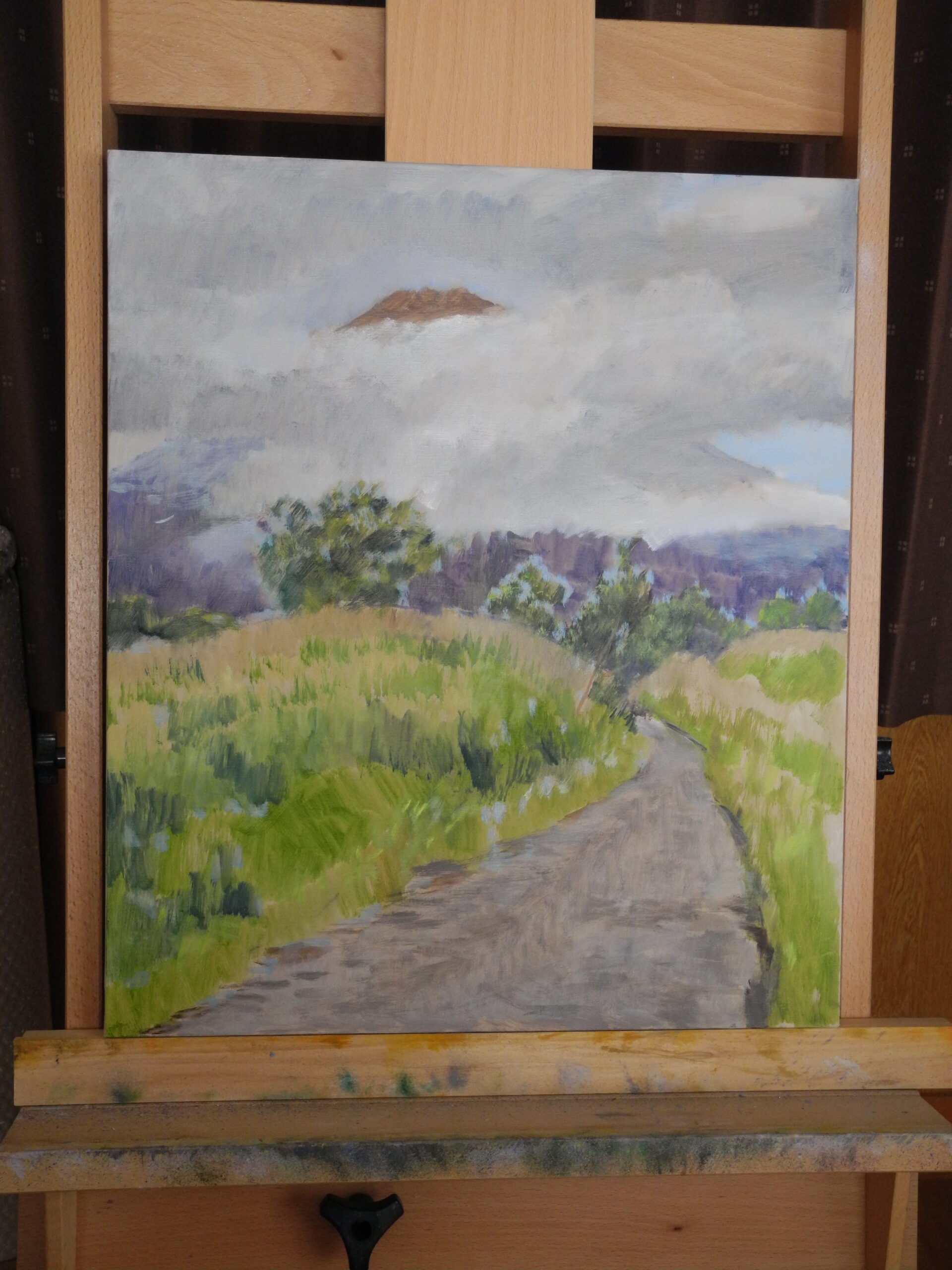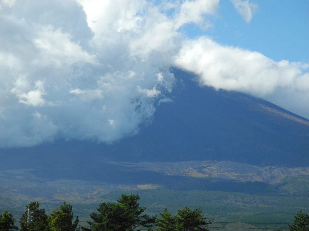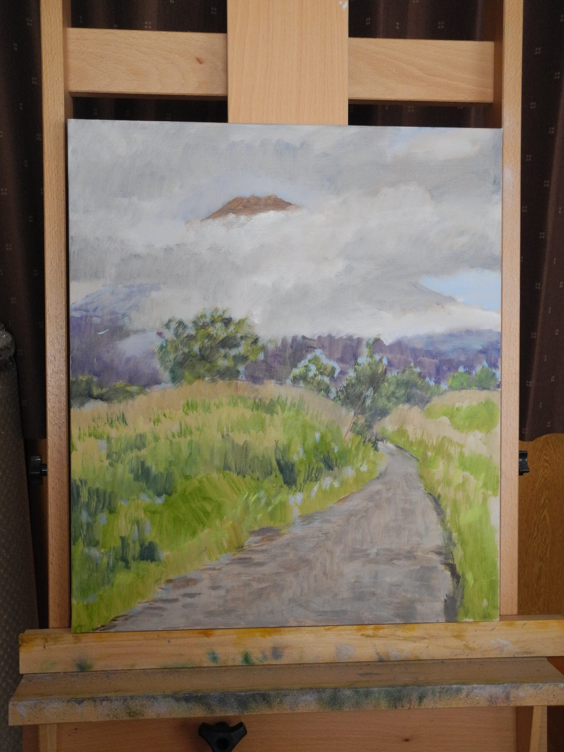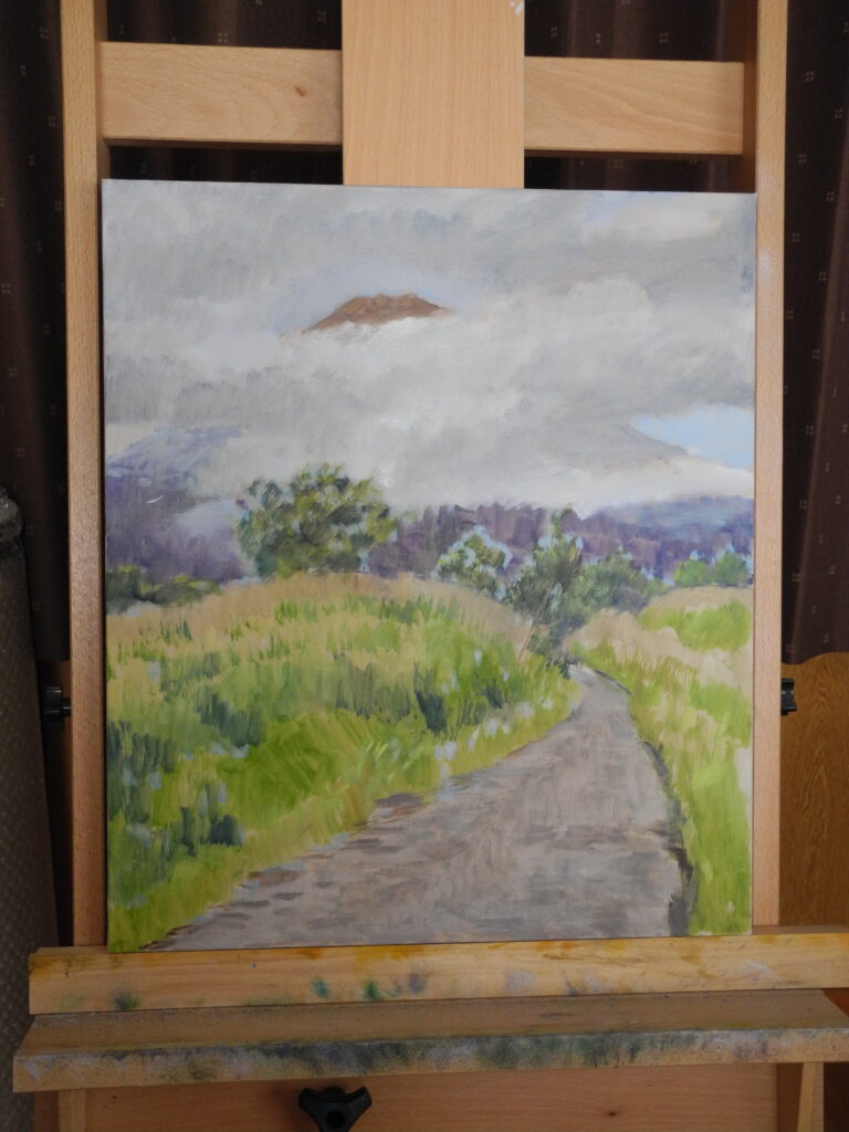 いつものように、描き終える頃には、写真のように山頂は雲に隠れる。そのために、本来の私の描き方は、またイーゼル画では全体から部分に向って描き進めるのだが、富士の場合はやむなく先に富士山頂から描いていくようにしている。