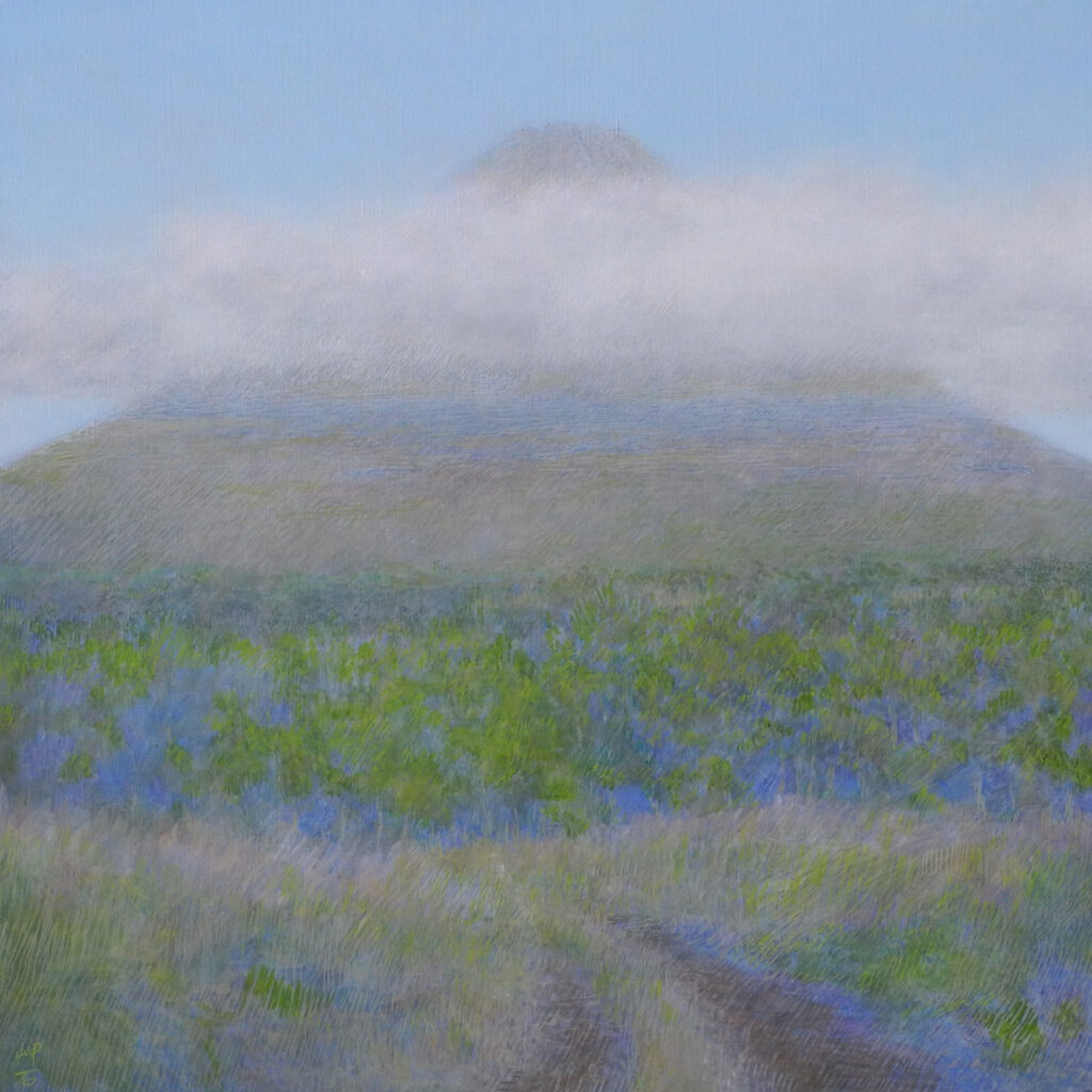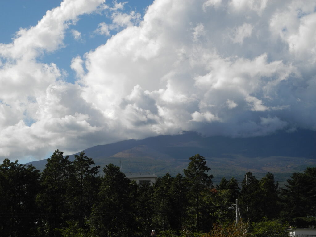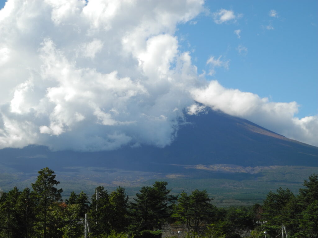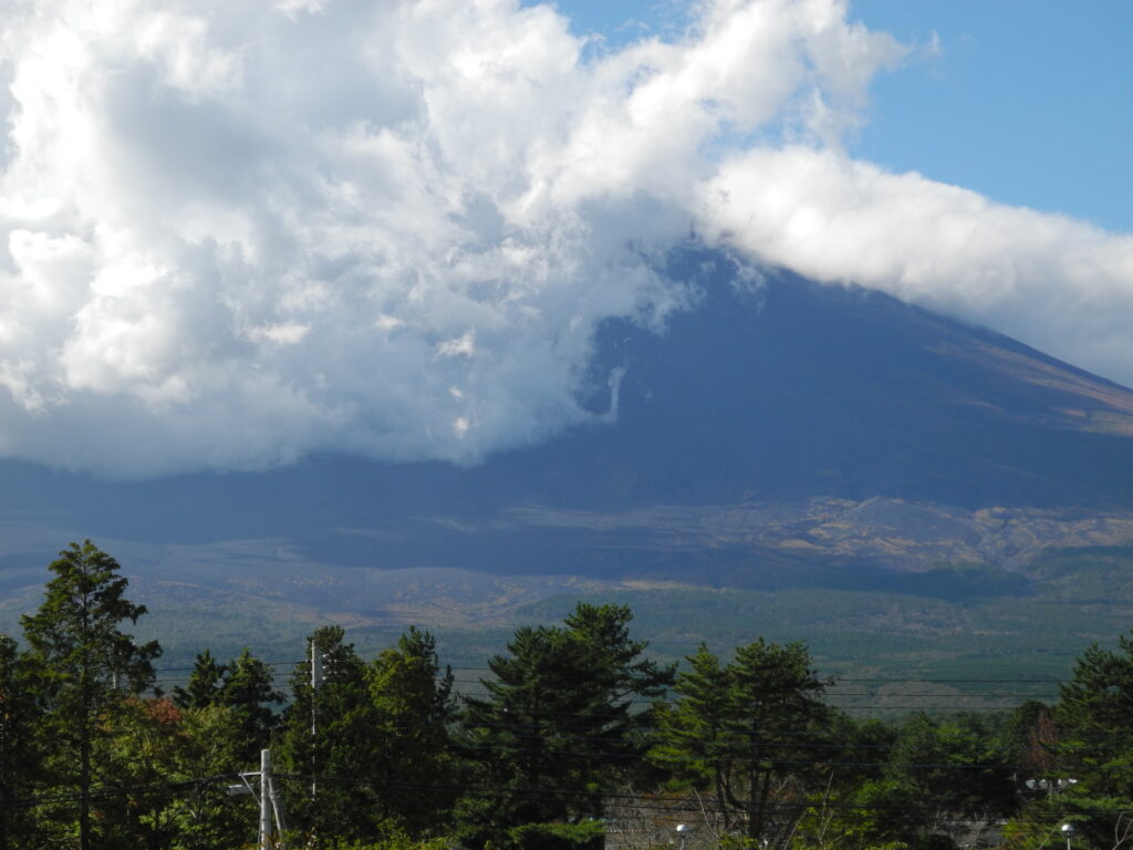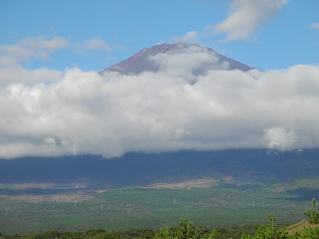 いつものように、描き終える頃には、写真のように山頂は雲に隠れる。そのために、本来の私の描き方は、またイーゼル画では全体から部分に向って描き進めるのだが、富士の場合はやむなく先に富士山頂から描いていくようにしている。