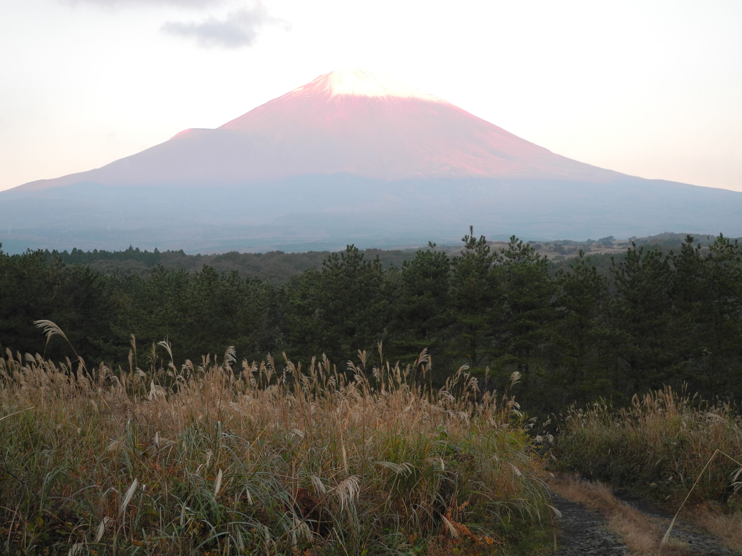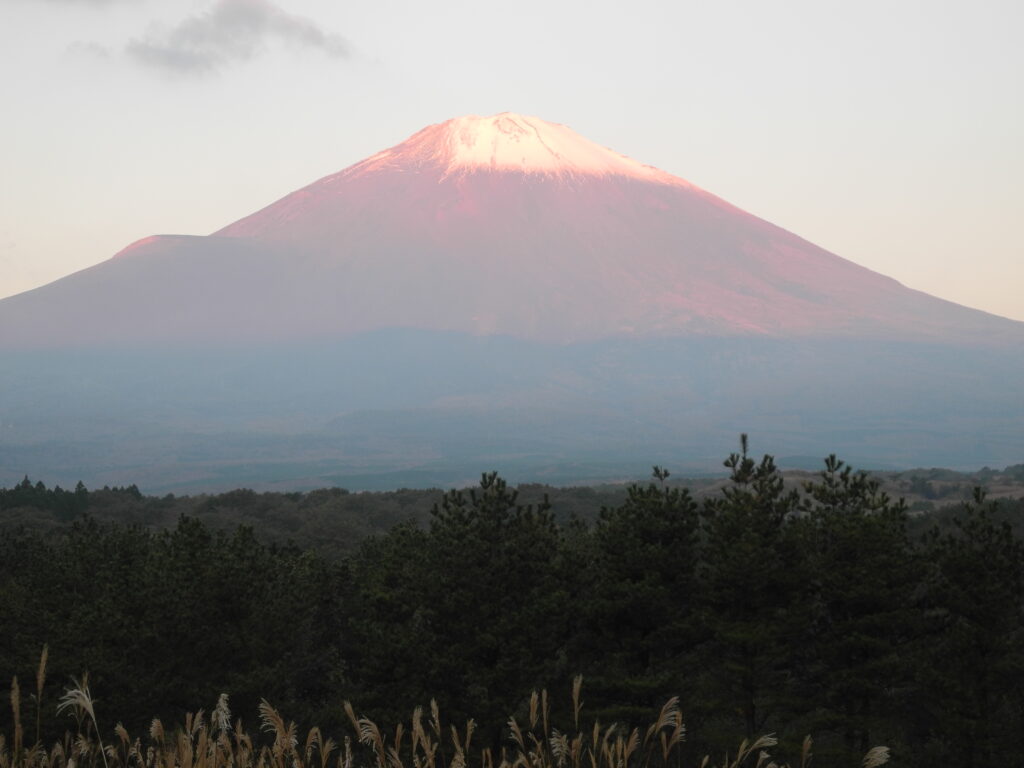 今週の御殿場行は、来週は引っ越し準備の片付けがあるので、御殿場でイーゼルを立てる最後の機会、ラストチャンスを富士との素晴らしいコラボレーションで終った。夜明け前の一瞬(20分位)頂上だけに光があたり、冠雪を紅に染める富士は、以前桜公園で描いたことがあるが、近景まで入れた、紅富士のラストチャンスに、幸運にも恵まれた。前日F25号のキャンバスを張って、朝5時半頃起床して現場に立ち、6時10分から7時15分まで約1時間、「存在」に反射する「光」の交響曲に包まれて、主客合一、本質直感、捨身本能覚(しゃしんほんのうがく)で筆を走らせた幸せなひと時でした。