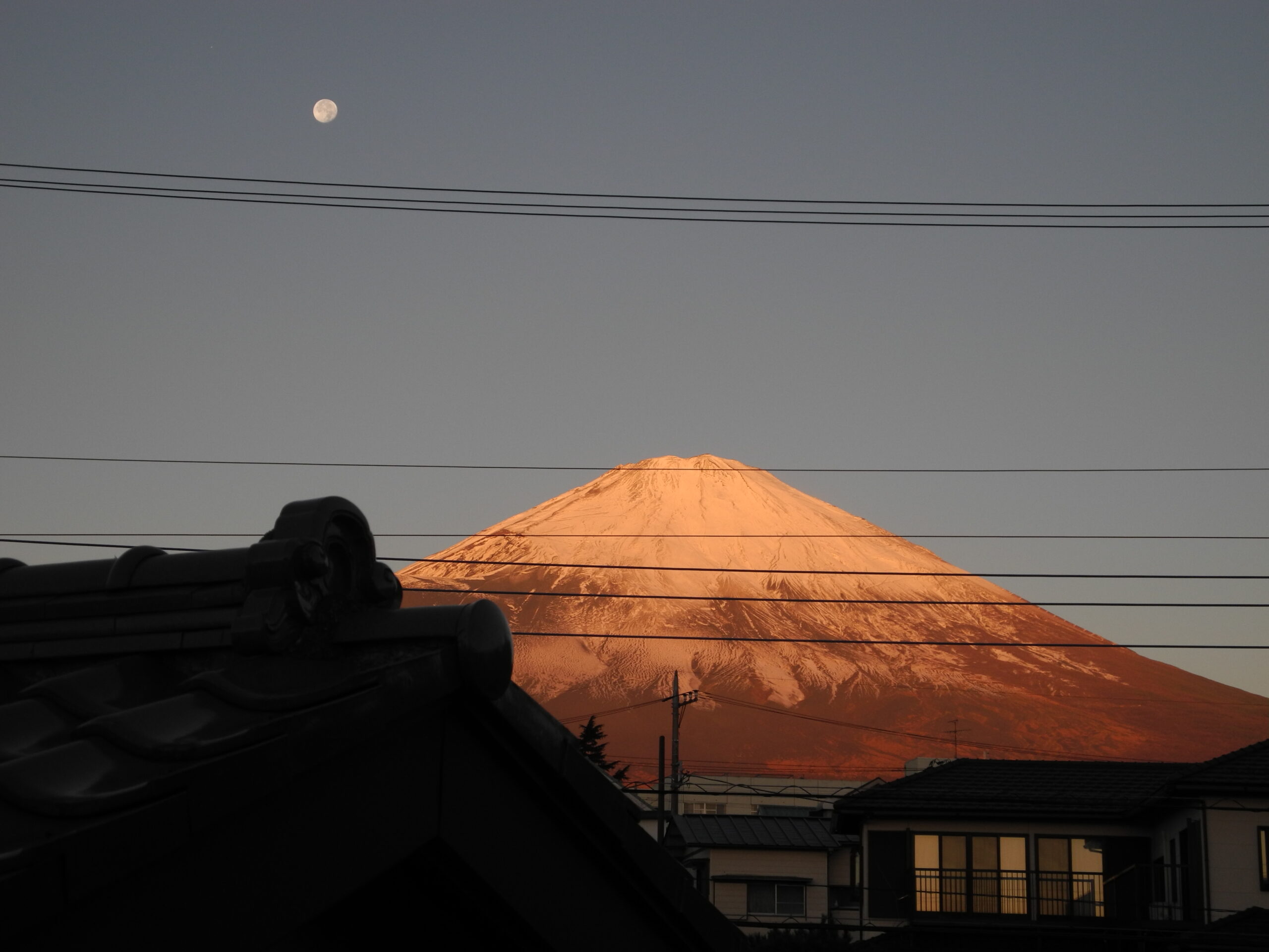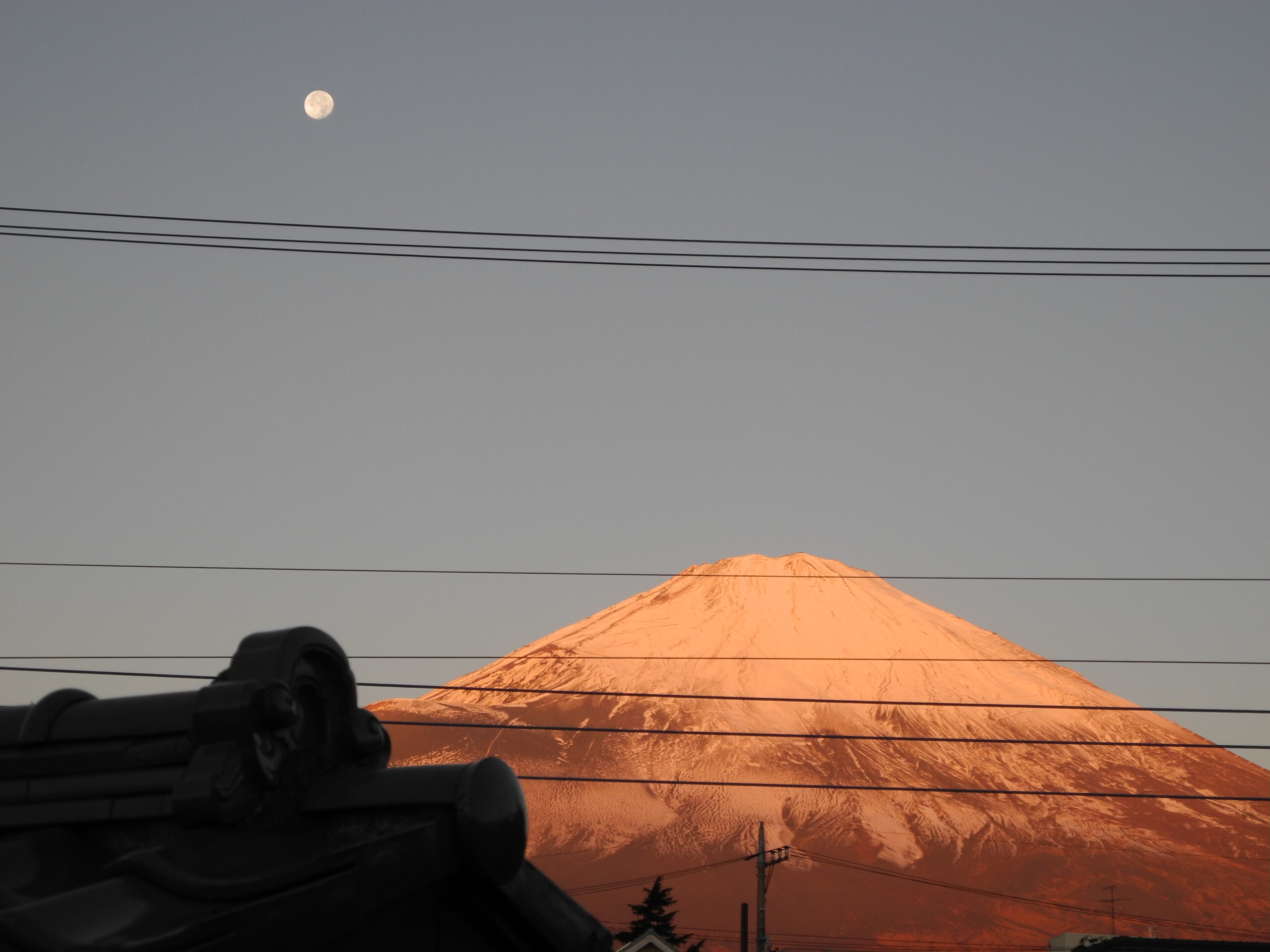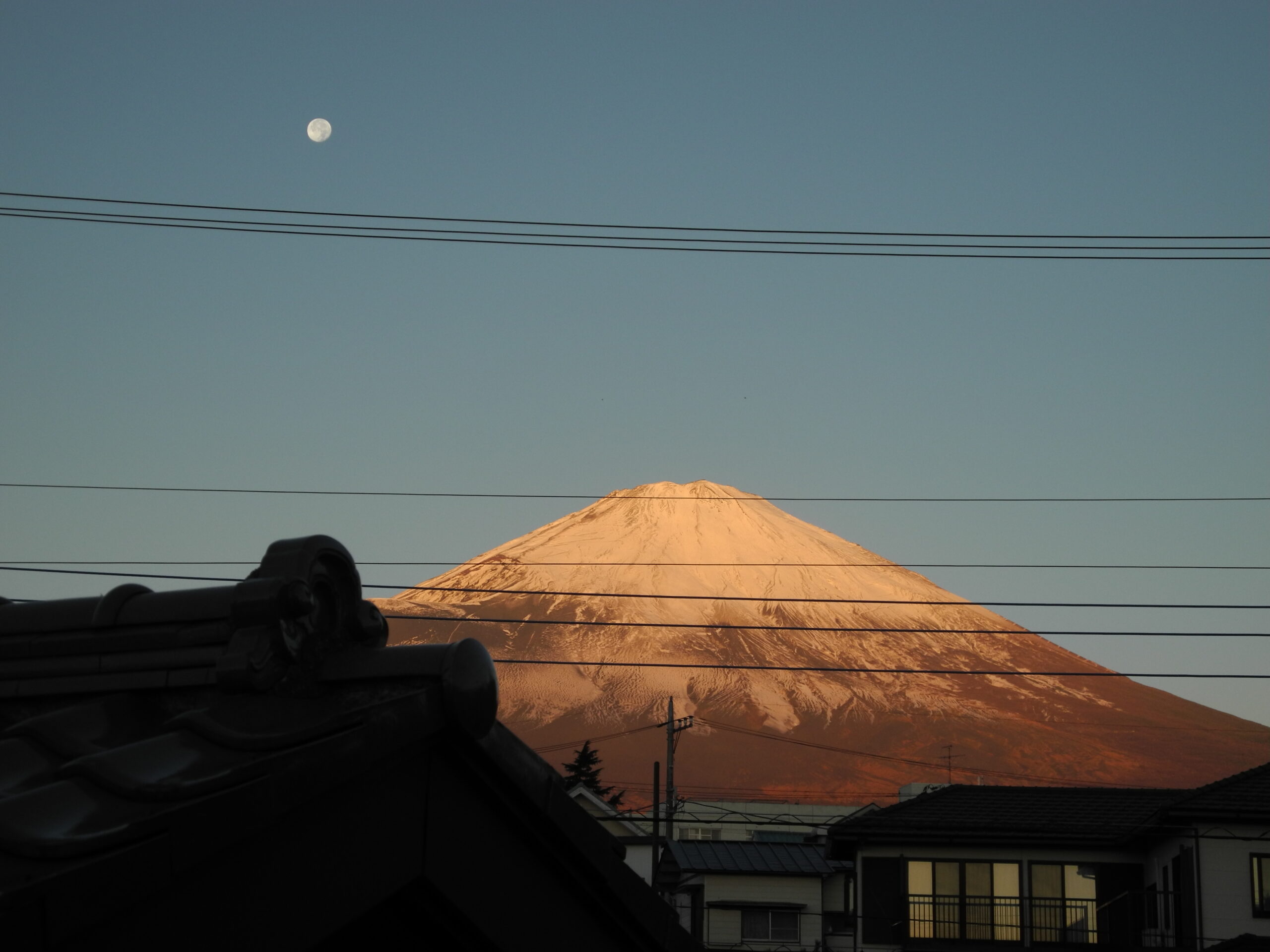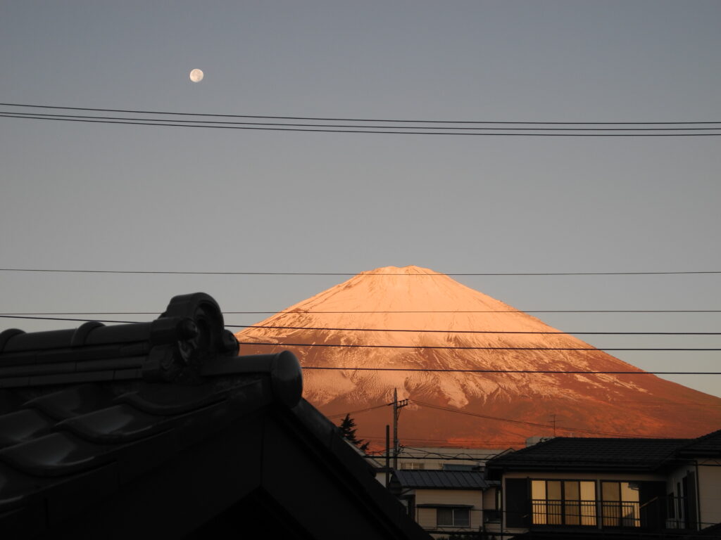 昨日(20日)、御殿場から山中湖村に引っ越しが終った。引っ越し後の片付けに忙殺され、山中湖村での写真が撮れなかった。そのため、引っ越しの日の早朝、満月に近い残月が、冠雪の富士の横に出ていたので、おもわず御殿場の借家の2階から撮った写真を載せます。写真がそれぞれビミョウに違うのは、オート撮影の他、カメラのシーン別オプションで、トワイライトや夕焼け他で撮ったためです。